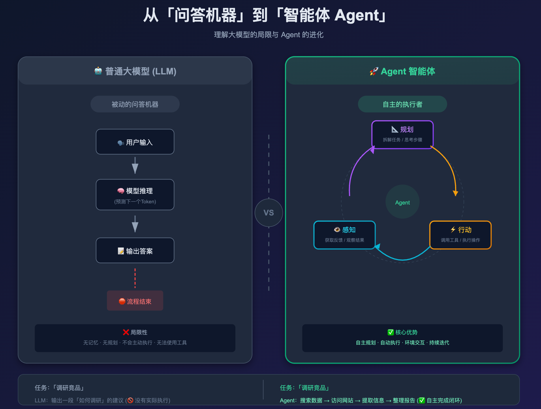 Agent 就完全不一样了。它有一个核心的运作闭环:感知 -> 规划 -> 行动 -> 再感知。