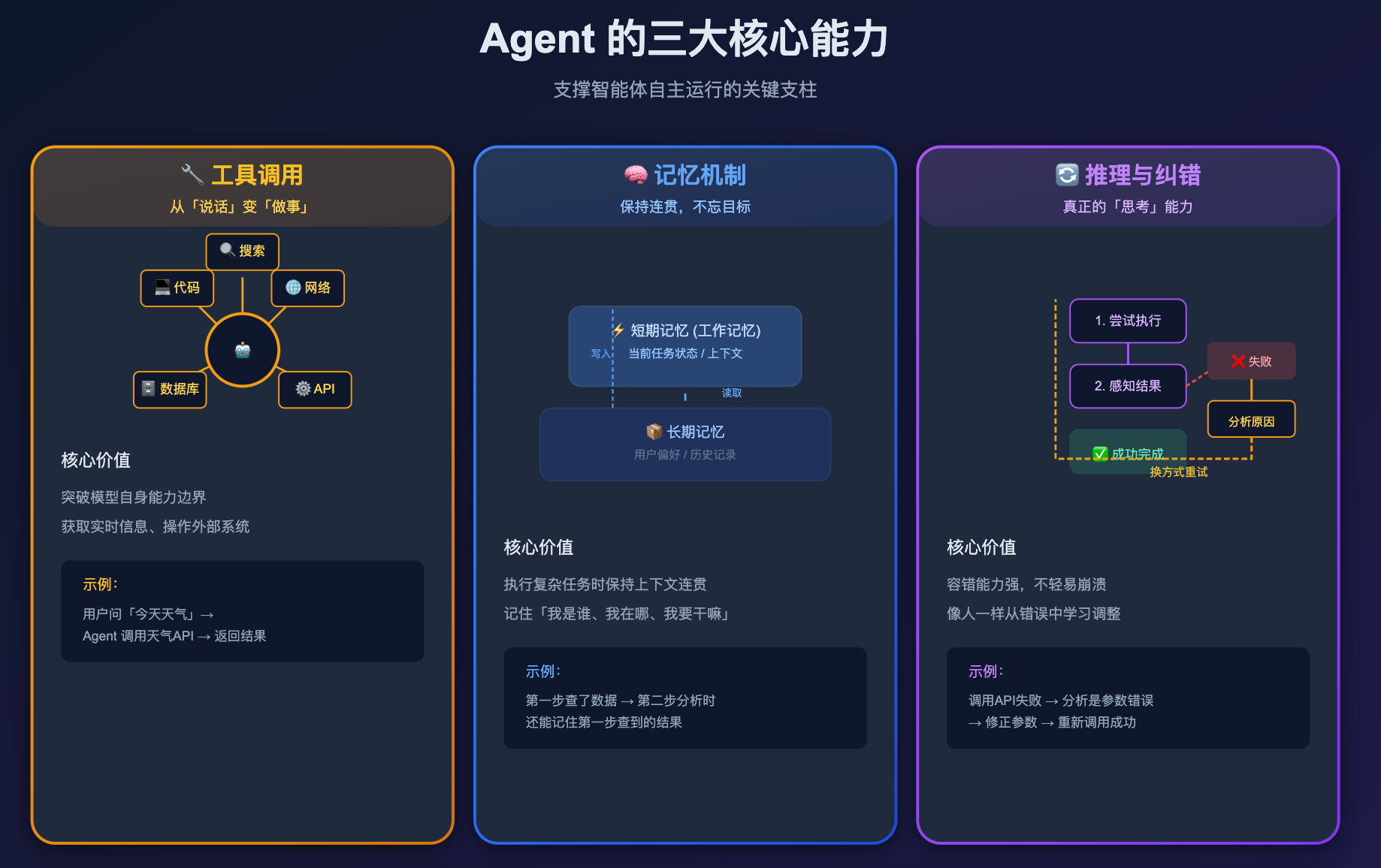 第三件:多步推理和自我纠错。Agent 在执行过程中如果某一步失败了,能感知到失败、分析原因、换一种方式重试,而不是直接崩掉。这就像一个真正在「思考」的执行者,而不是一个只会背答案的系统。