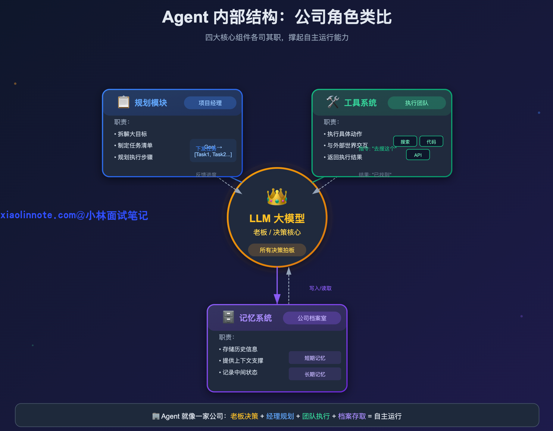 你可以把整个 Agent 系统类比成一家公司:LLM 是老板,所有决策都经过它拍板;工具系统是外包执行团队,老板说「去搜这个」「去发这封邮件」,他们负责真正干活;记忆系统是公司档案室,各种信息的存档和调档都靠它;规划模块是项目经理,拿到一个大目标后负责拆解成可执行的任务单。四个角色各司其职,才撑起了 Agent 的自主运行能力。