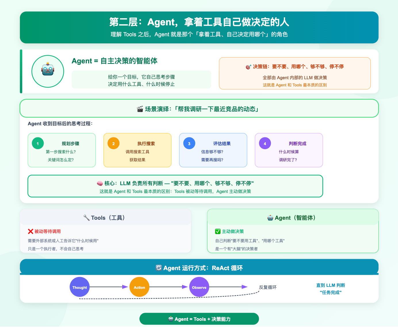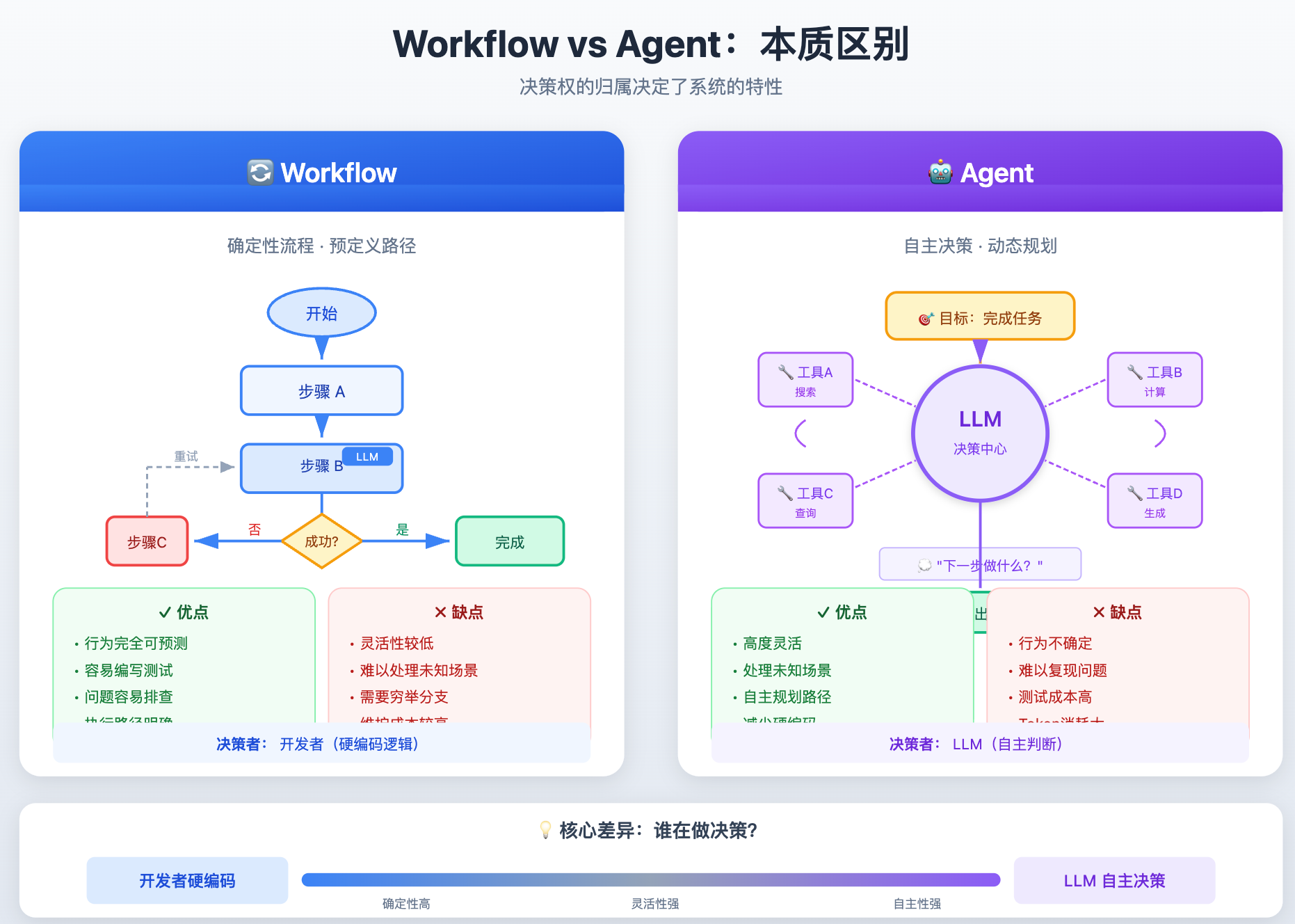 Agent 则相反,它把「下一步做什么」这个决策权交给了 LLM。你只告诉它目标,它自己判断该调哪个工具、该不该继续、什么时候算完成。好处是能处理你事先没设计进去的情况;坏处是行为不确定,同样的输入可能走出不同的路径,线上出了问题也很难复现。