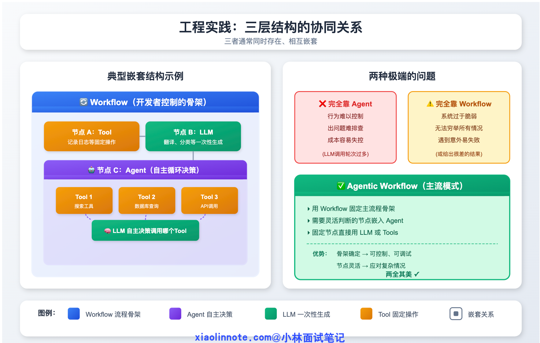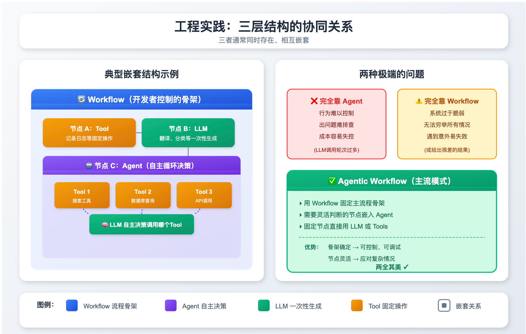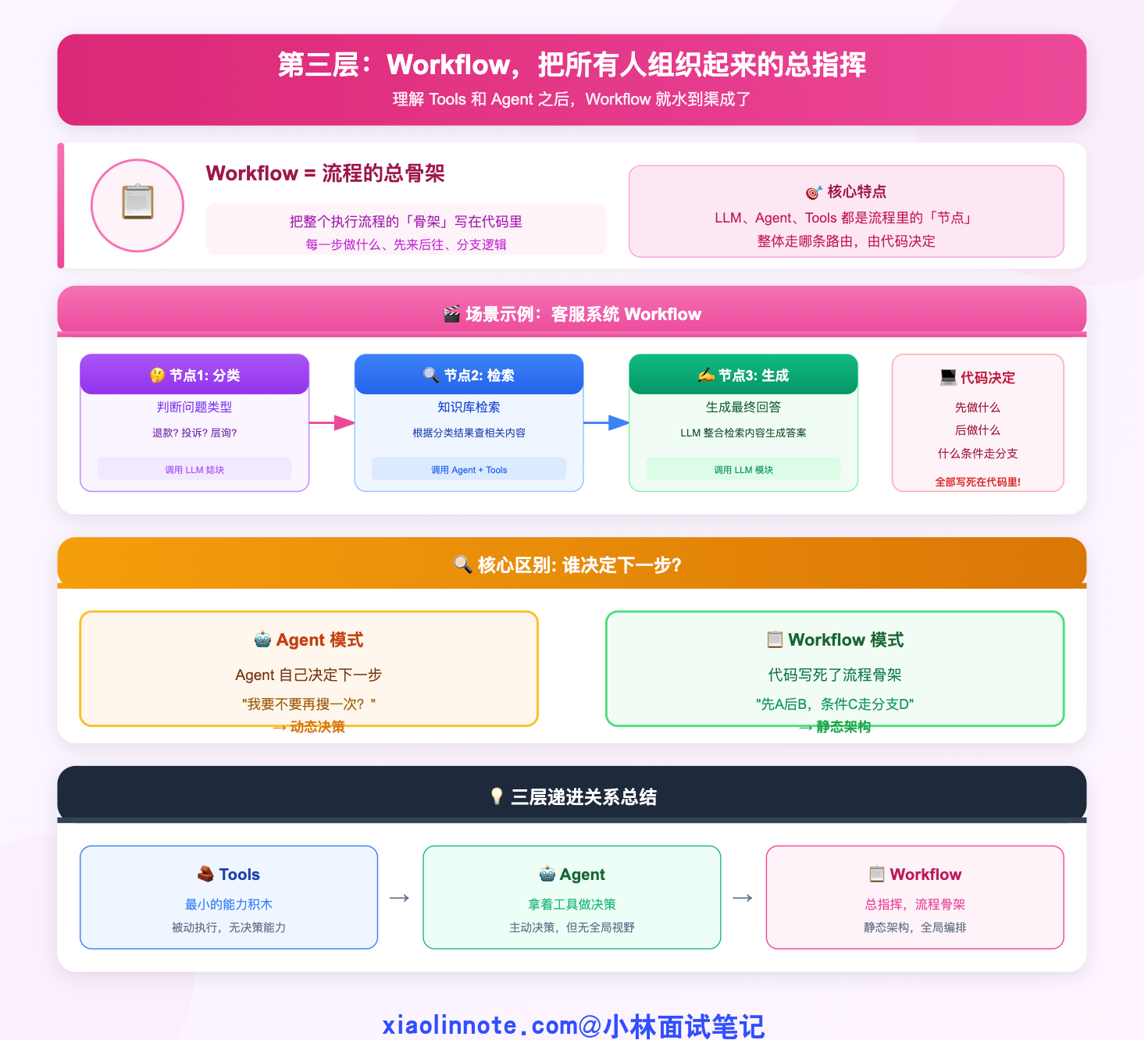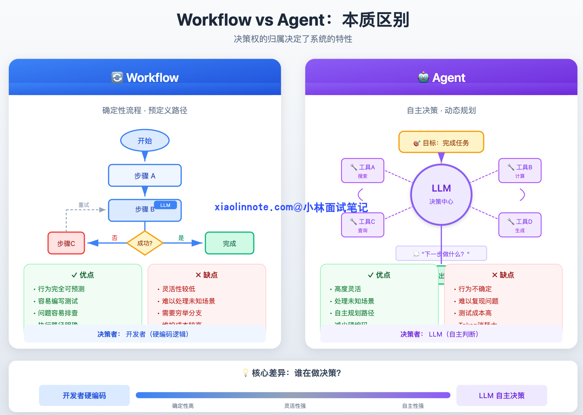 先把两者的本质区别说清楚。Workflow 就是一个确定性的流程图,你提前定好「第一步做 A,A 完了做 B,B 失败了走分支 C」,每一步的逻辑都是你硬编码进去的,LLM 只是其中某个节点的执行工具,不负责决策流程本身。好处是行为完全可预测、容易测试、出了问题好排查;坏处是灵活性低,遇到你没预料到的情况就会走入死胡同。