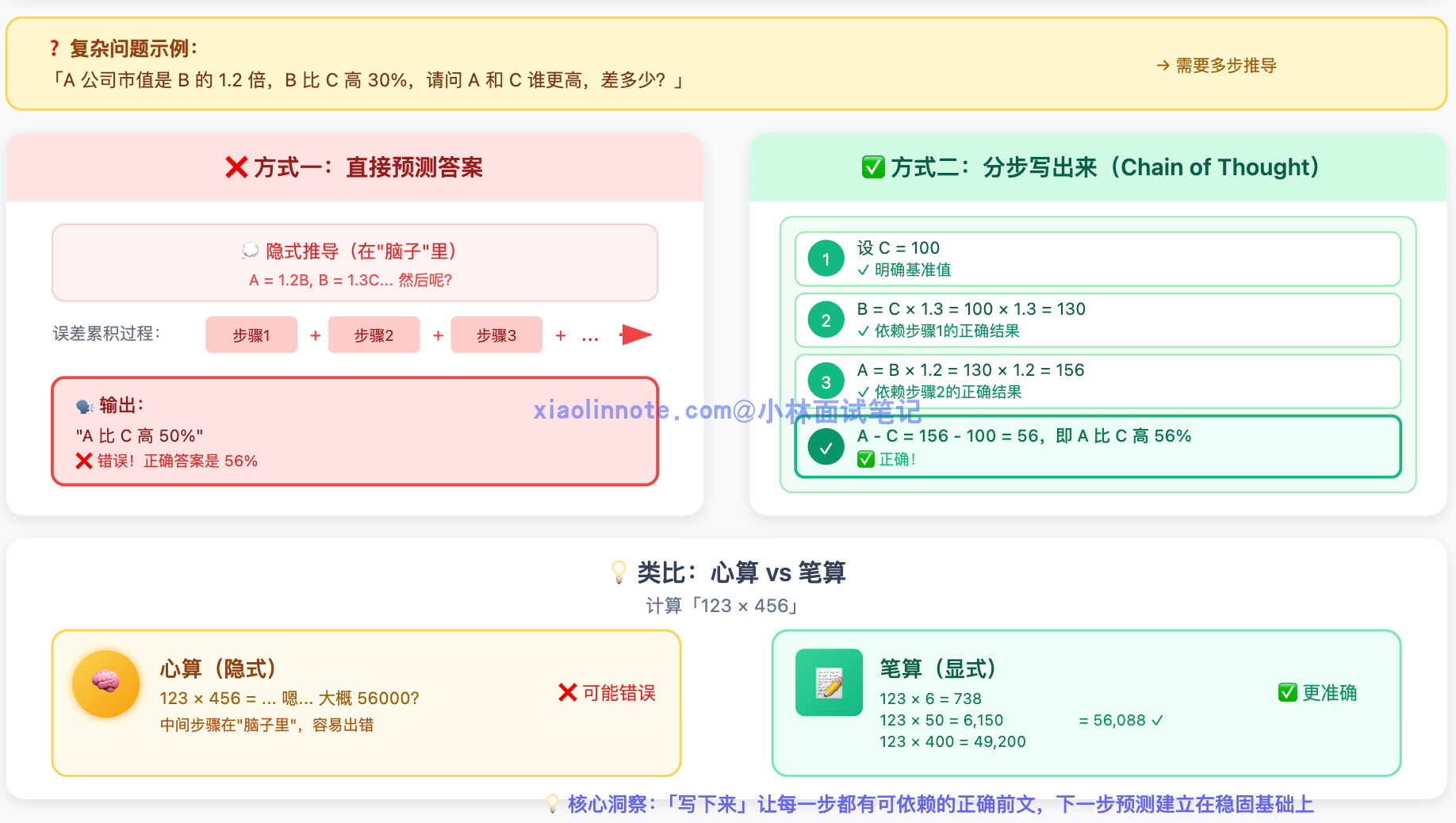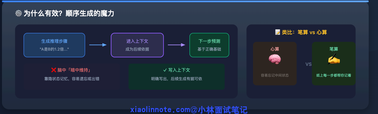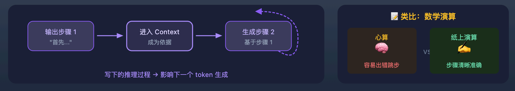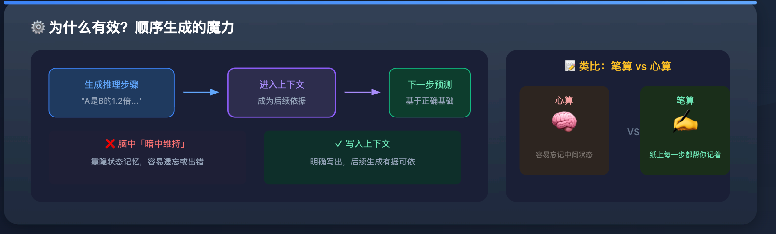 本质是因为 LLM 的输出是顺序生成的,当它先输出推理步骤,这些推理内容会进入上下文,影响下一个 token 的生成。换句话说,「写下来的推理过程」本身就成为了后续生成的依据,帮助 LLM 不跳步、不乱想。就好比你在纸上演算数学题,把每一步写出来之后,下一步出错的概率会比在脑子里算要低得多,原理是一样的。