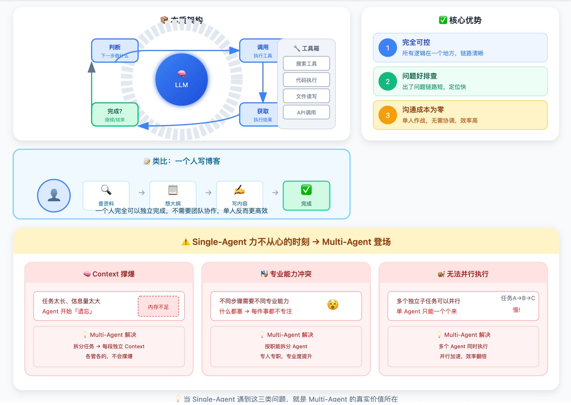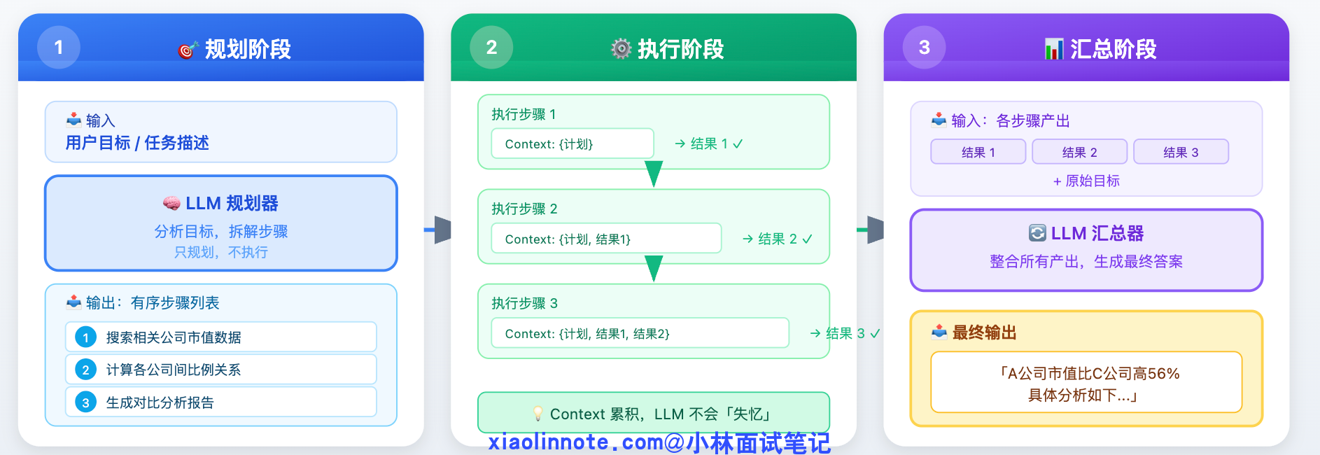 代价是如果任务中途某步出了大问题,到最后才发现,前面的执行都已经浪费了。适合步骤之间相对独立、最终输出的整体质量更重要的场景,比如生成一份报告。