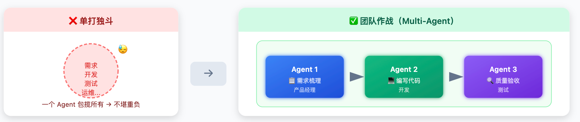 通信方式的选择同理:如果你的多 Agent 流程是一条相对清晰的流水线,各步骤之间有明确的前后依赖,就用共享状态,简单直接;如果你的系统需要让多个 Agent 独立并行、互相不感知对方的存在,就用消息传递,解耦清晰。