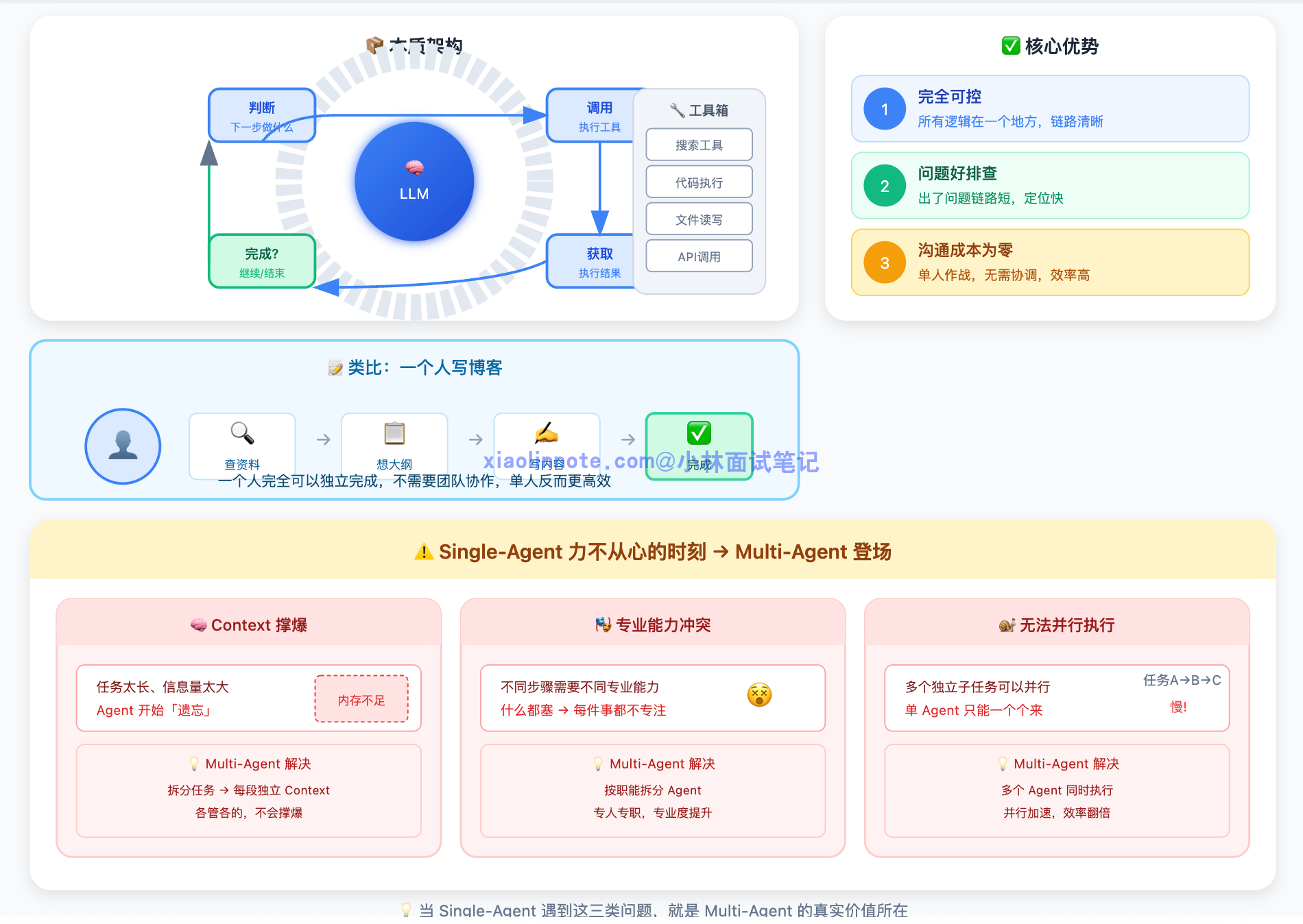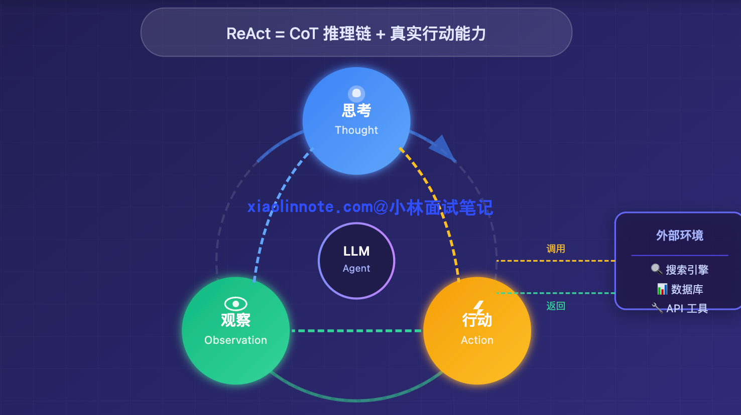 我理解 Agent 的基本架构有四个核心组件:LLM、工具、记忆、规划模块。LLM 是整个系统的大脑,负责理解任务和做决策;工具让 Agent 能跟外部世界交互,搜索、执行代码、调 API 都靠它;记忆让 Agent 在任务执行过程中保持状态,不会「失忆」;规划模块负责把复杂目标拆解成可执行的步骤。这四个组合在一起,才让 Agent 具备了自主完成任务的能力。
