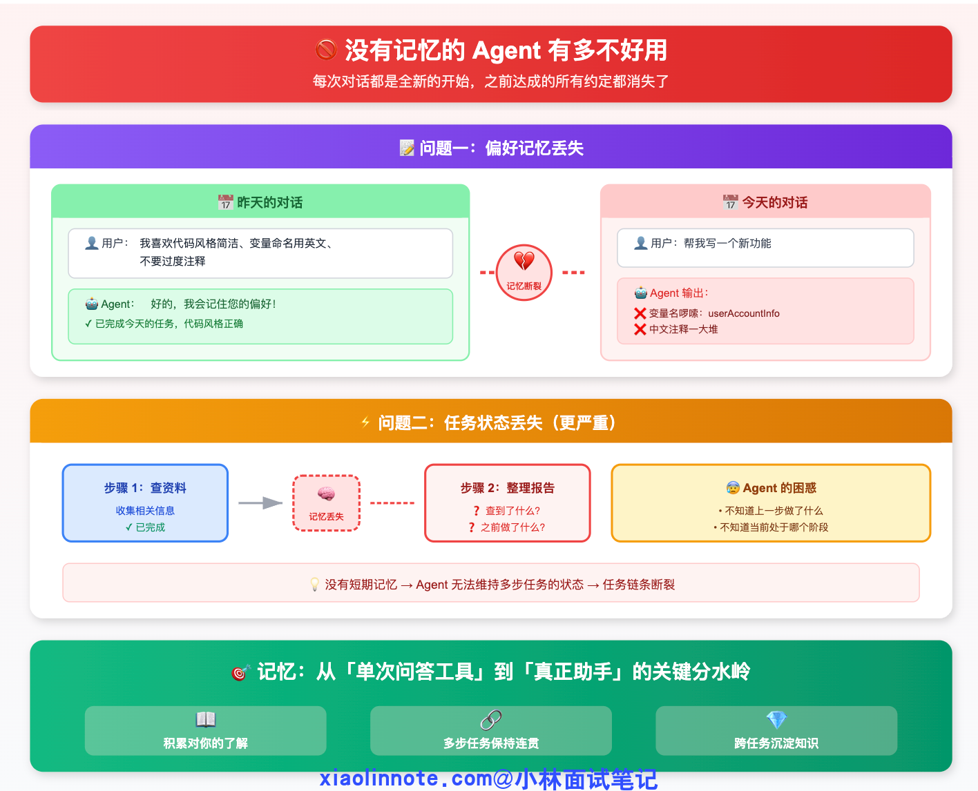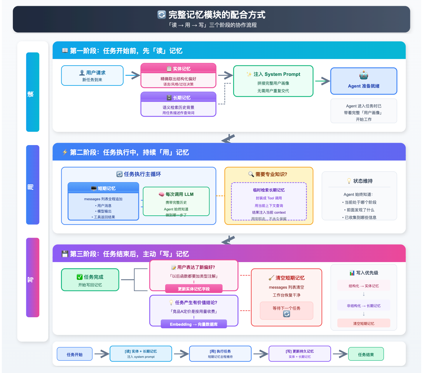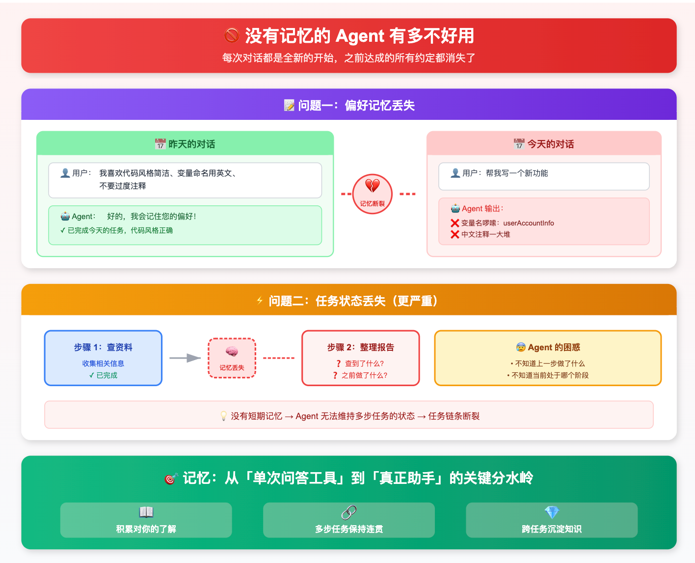 第二件:记忆机制。传统 LLM 每次对话都是「失忆」的,除非你手动传上下文,不然它完全不记得上一次说了什么。而 Agent 系统通常会设计短期记忆(当前任务的中间状态)和长期记忆(跨任务的用户偏好、历史操作记录),这让它在执行复杂任务时能保持连贯性,不会做到一半忘了目标是什么。