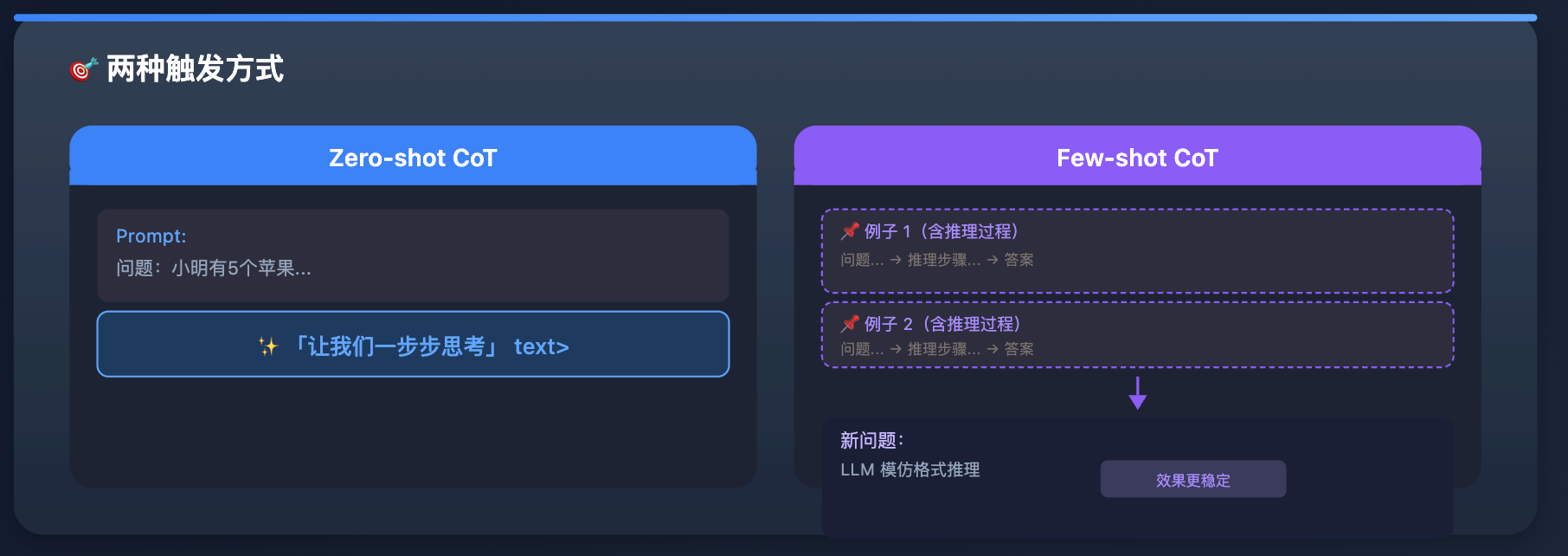 - 第二种叫 Few-shot CoT,给几个带有完整推理过程的例子,让 LLM 模仿这种推理格式来回答新问题,效果通常更稳定。
