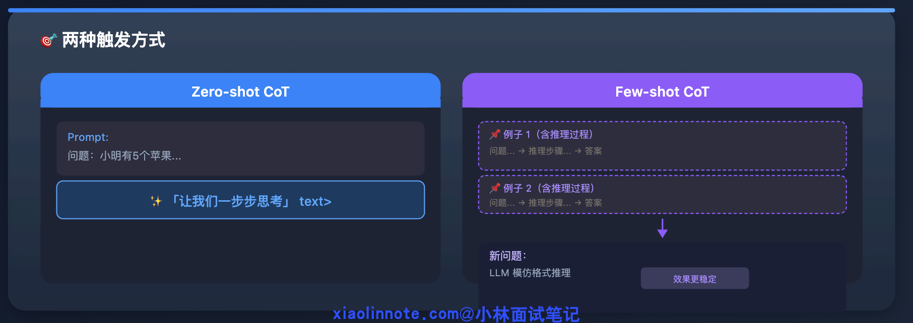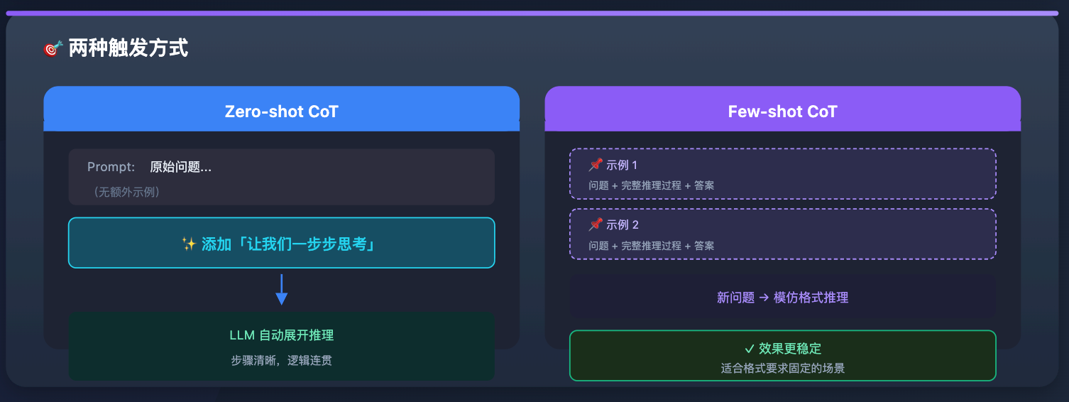 - 第一种叫 Zero-shot CoT,就是直接在 prompt 末尾加「让我们一步步思考」,LLM 自己展开推理,不需要额外例子;