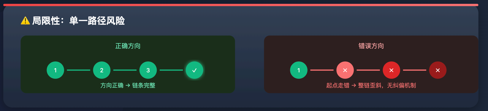 背后的原因是 Transformer 的 next-token 预测机制,每个 token 是基于前面所有 token 生成的,推理链越长、隐式的跳步越多,误差就越容易在中间某一步悄悄累积,最后给出一个看起来很自信但其实是错的答案。