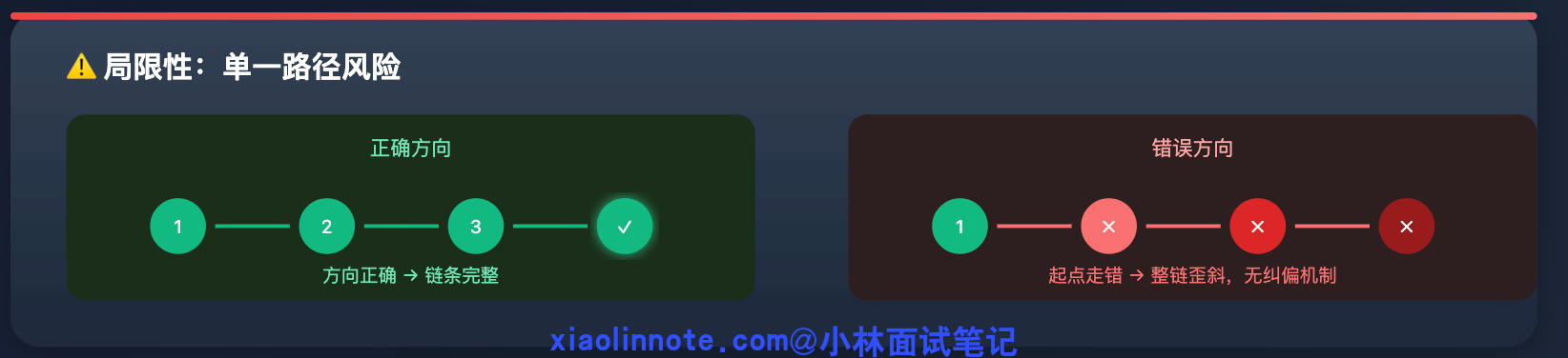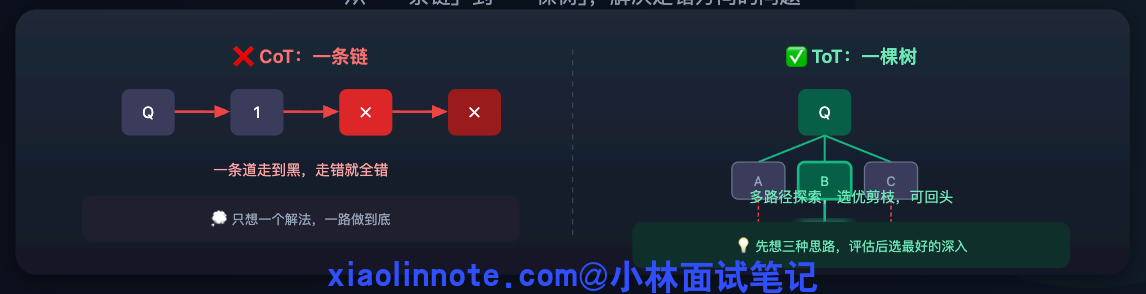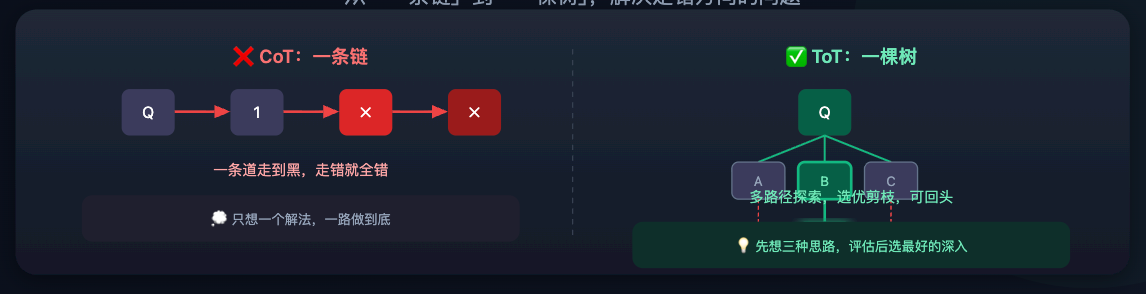 CoT 的局限很明显:它只有「一条推理路径」。如果一开始走错了方向,整条链就歪了,没有任何纠偏机制。