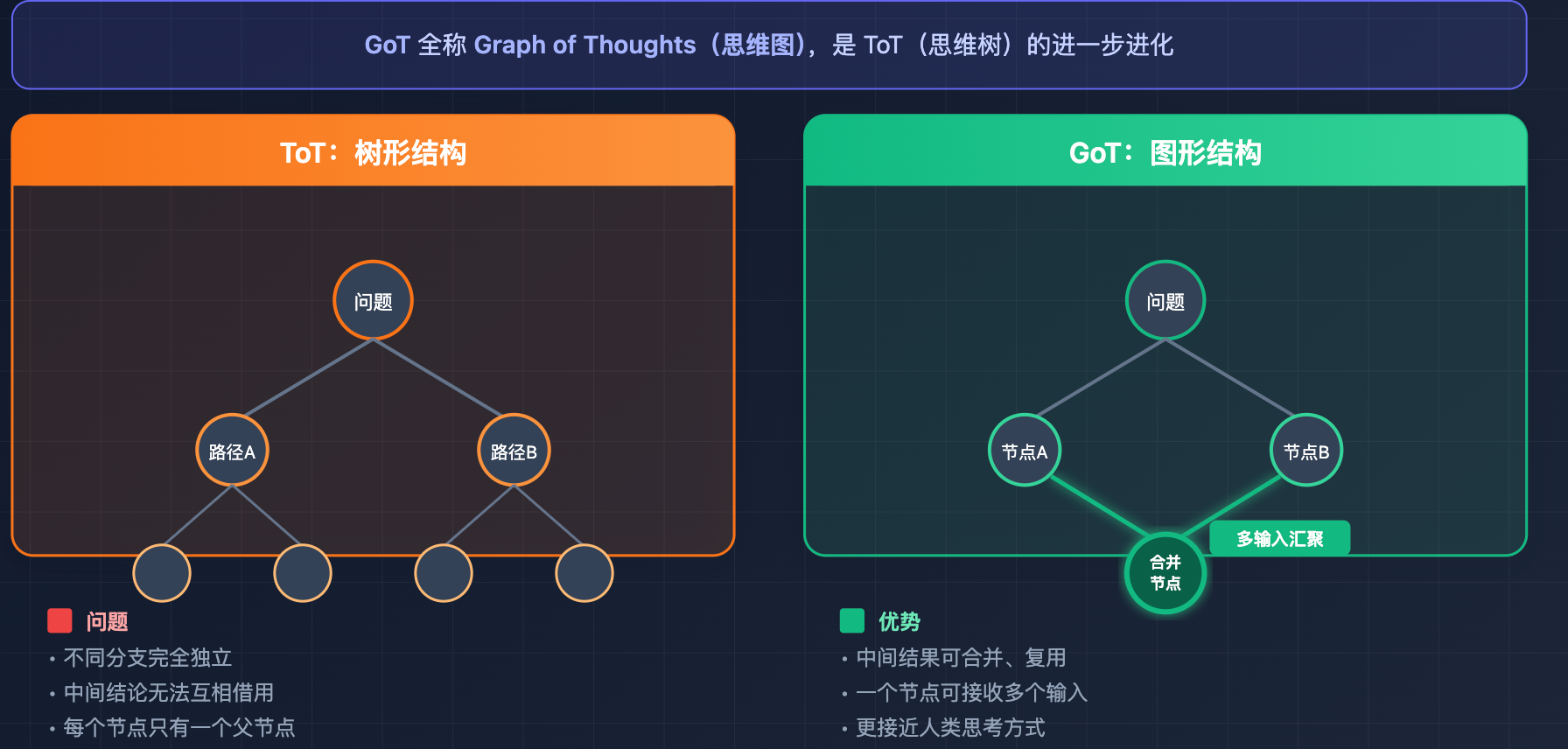 举个具体例子:如果任务是「分别研究竞品 A 和竞品 B,然后做综合对比分析」。ToT 里研究 A 和研究 B 是两条独立的路径,各自得出结论;但「综合对比分析」这一步需要同时用到两条路径的结论,在树形结构里很难自然表达,因为树的每个节点只有一个父节点。GoT 的图结构允许把「研究 A 的节点」和「研究 B 的节点」的输出,汇聚到「综合对比分析节点」,这种「多个中间结论合并输入到下一步」的操作在图里是一等公民,表达起来非常自然。