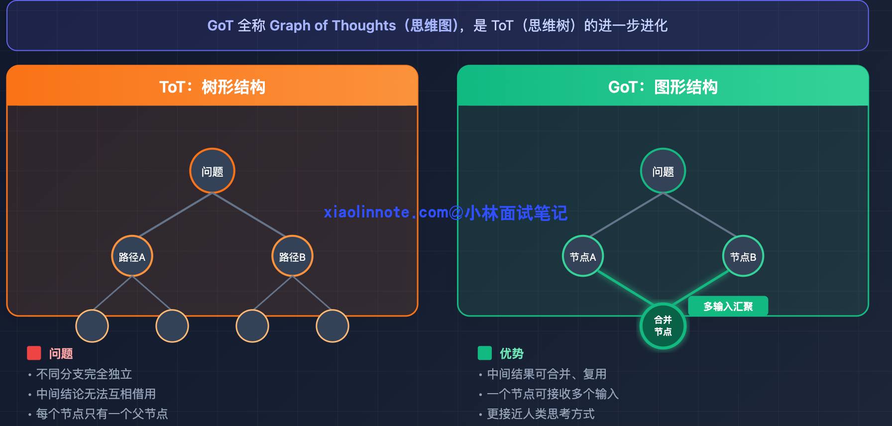 GoT 能建模的推理模式比 ToT 更丰富,也更接近人类实际处理复杂任务的思考方式。但落地复杂度很高,目前主要还是学术研究场景,生产环境里极少见到真正用起来的。