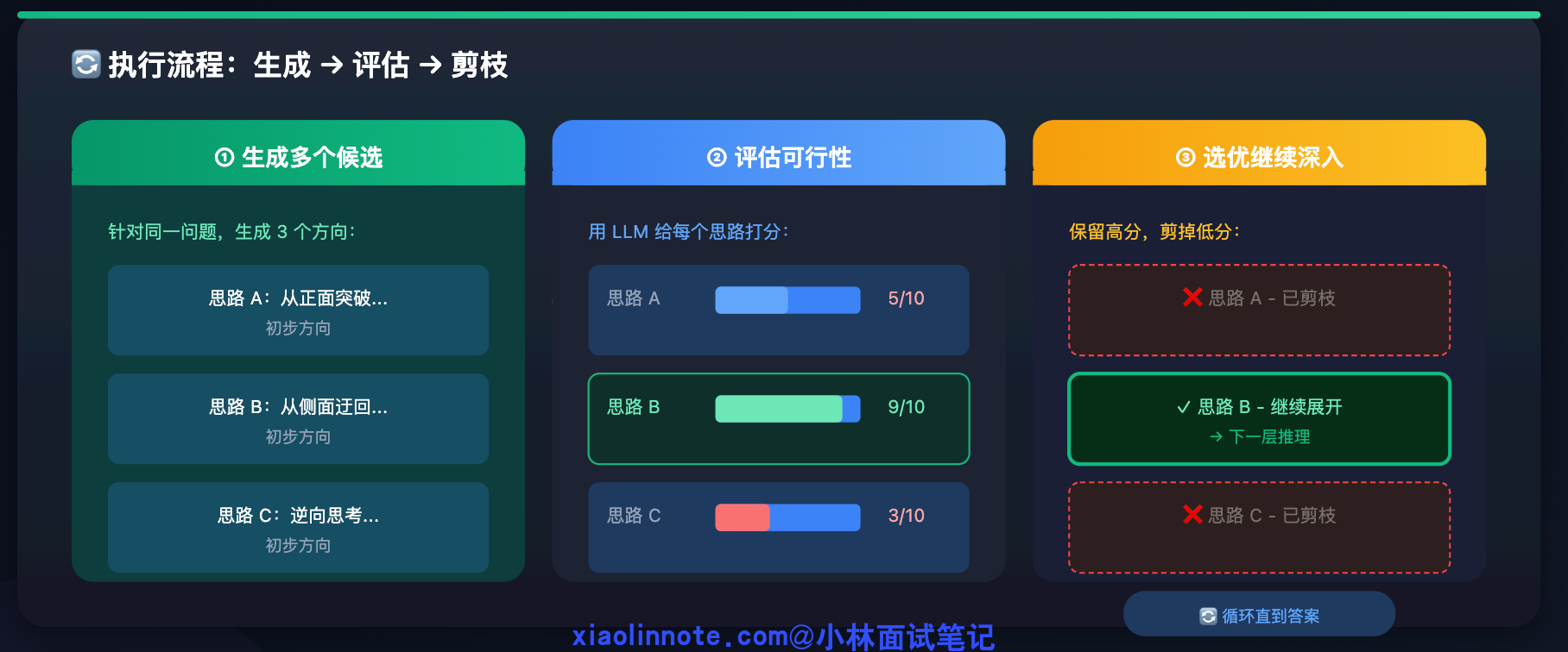ToT 的执行流程可以分三步来理解。首先是生成多个候选思路,让 LLM 针对同一个问题给出 3 个不同的初步方向,而不是只走一条路。然后是评估每个思路的可行性,用另一个 LLM 调用(或同一个 LLM 带上评估 prompt)给每个思路打分,判断哪个最有希望。最后是选优继续深入、剪掉差的,只保留分数高的思路,再展开下一层推理,反复循环直到得出最终答案。