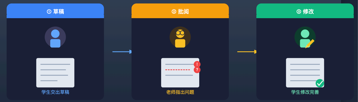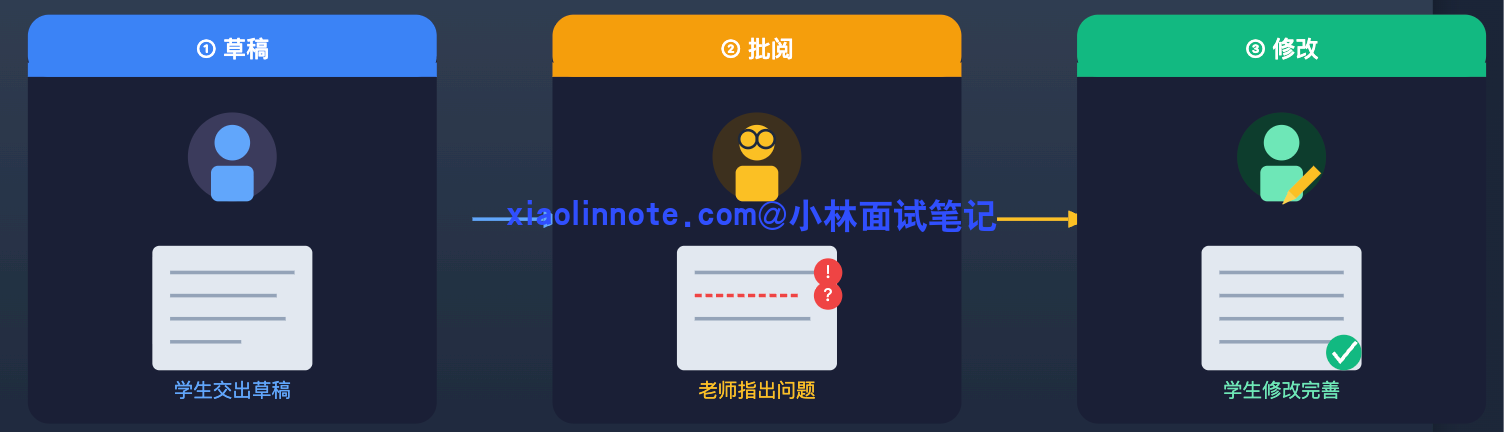 你可以用「草稿 -> 批阅 -> 修改」来类比:学生交出草稿(生成),老师批阅指出问题(评估),学生拿着批注修改(改进),改完的稿子再经过老师审阅,直到通过为止。