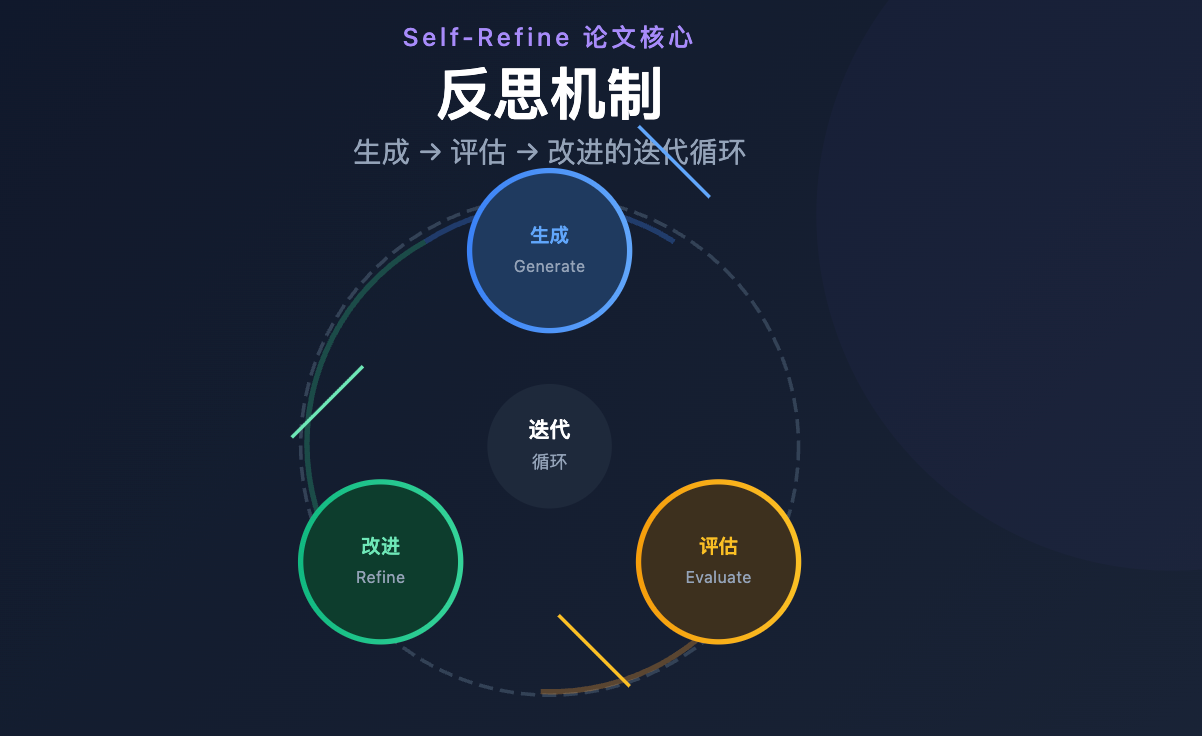 反思机制的核心思路来自 Self-Refine 论文,整个流程就是「生成 -> 评估 -> 改进」的循环。