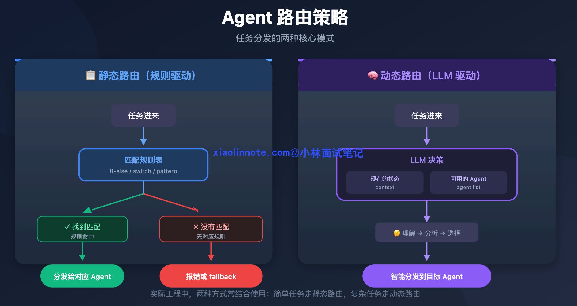 实践中最稳健的做法是两种路由组合用:主流程用静态路由,把确定性的节点切换都写成规则,保证绝大多数情况下系统行为稳定可预测;只在遇到没有匹配规则的边缘情况时,才交给 LLM 动态决策。这样静态路由负责「保底」,动态路由负责「兜住异常」,两者互补。
