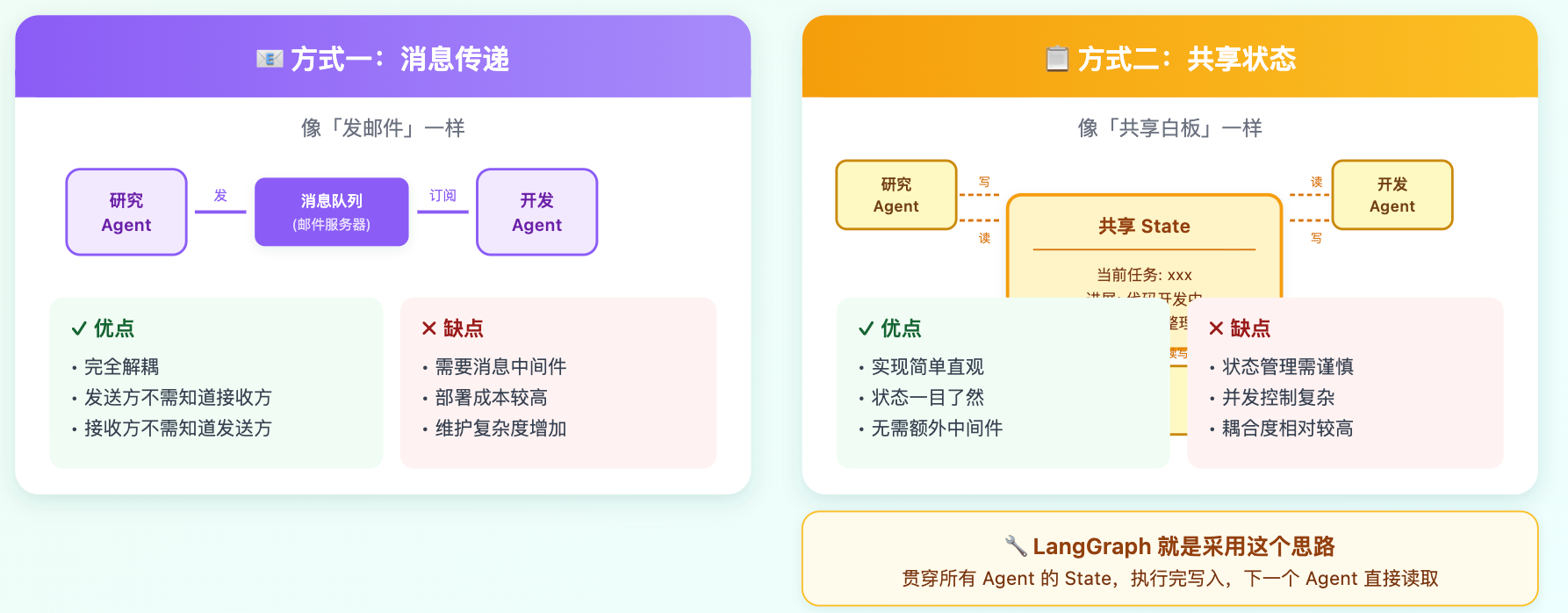 这两种方式怎么选?如果各 Agent 之间的依赖关系比较强,前一步的结果要直接传给后一步,用共享状态更直接。如果你希望 Agent 之间尽量解耦,互相不知道对方的存在,用消息传递更合适。