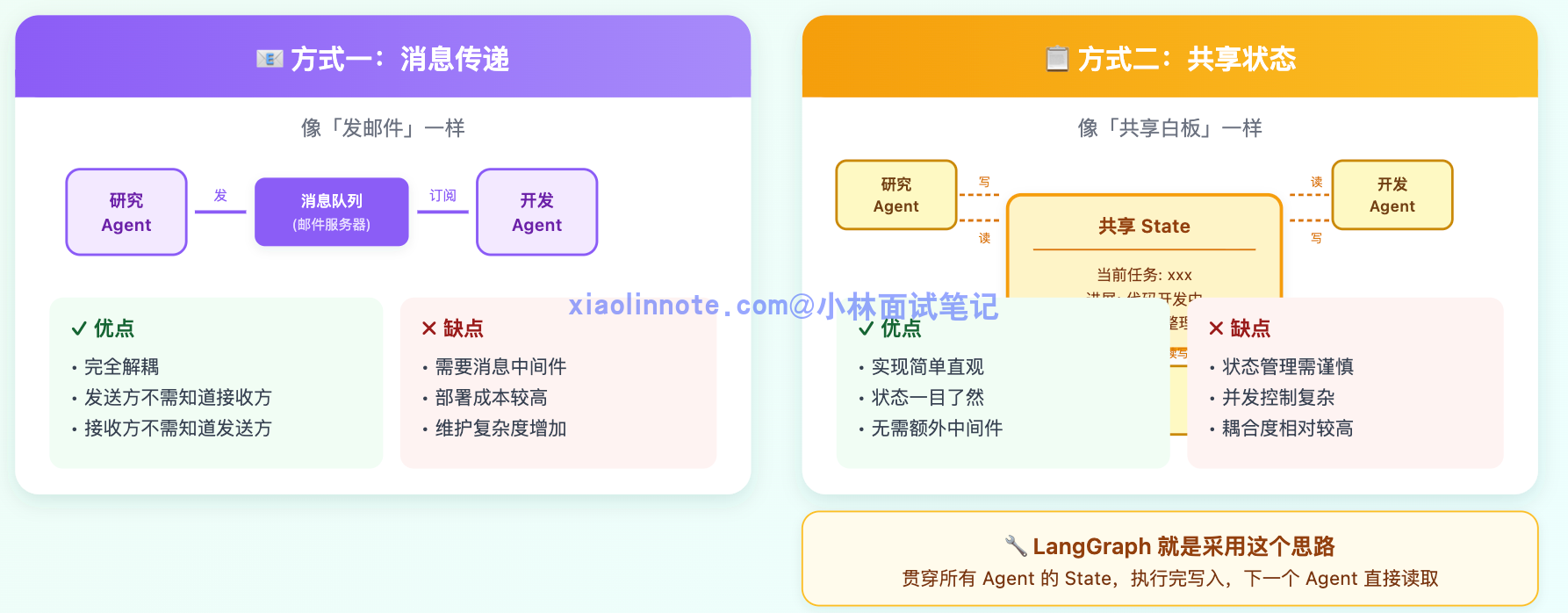 第一种方式,像发邮件:研究部完成了资料整理,就把报告「发」出去,开发部收到邮件后再开始工作。这就是「消息传递」的思路,Agent 完成自己的工作后把结果发送到一个消息队列,下游的 Agent 订阅自己感兴趣的消息,取到了再开始处理。这种方式最大的优点是解耦,研究 Agent 不需要知道谁在等它的结果,只管发;接收方也不需要知道消息是谁发的,只管处理。缺点是需要一个「邮件服务器」,也就是消息中间件来维护这套机制,部署成本稍高一些。