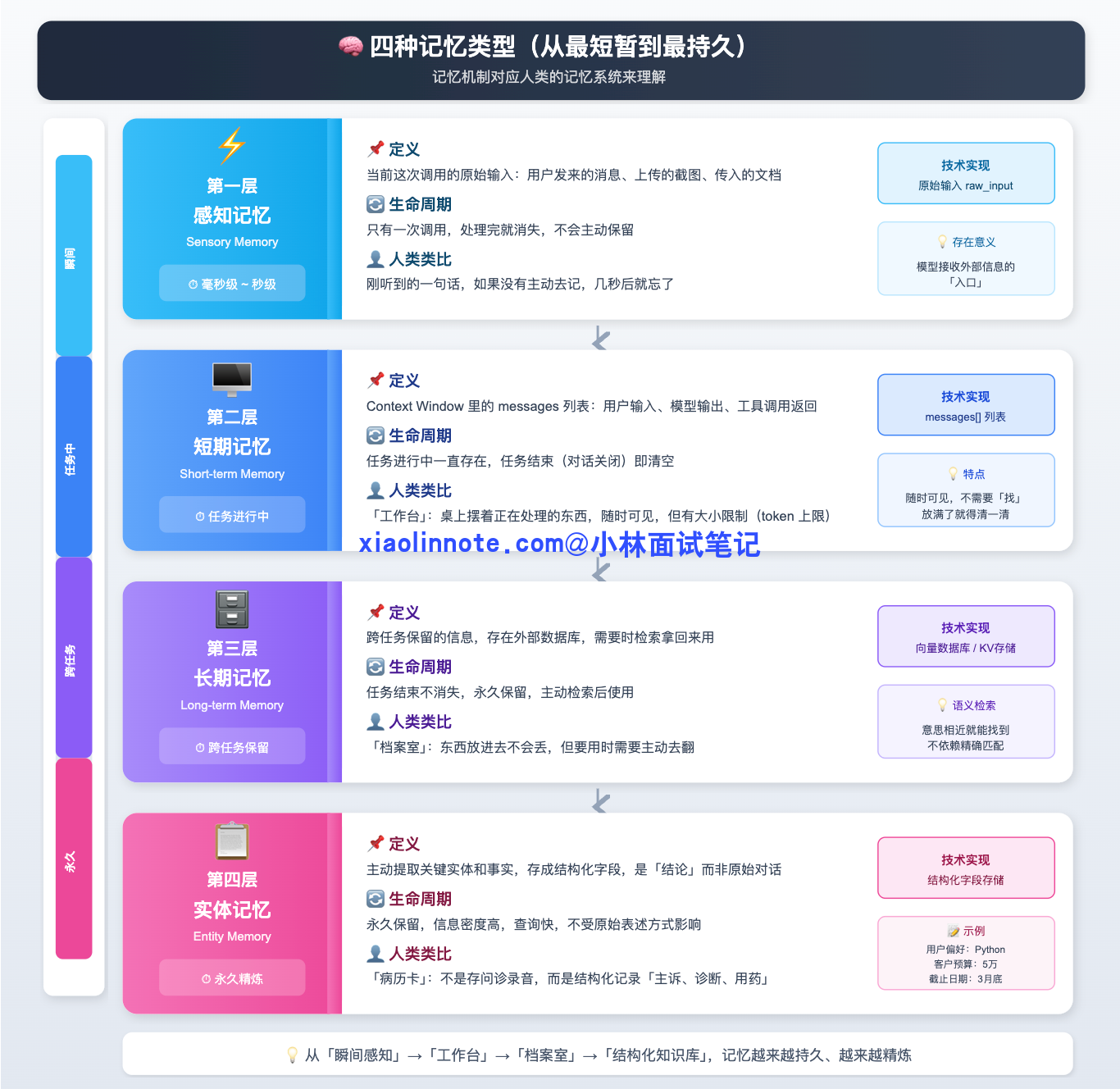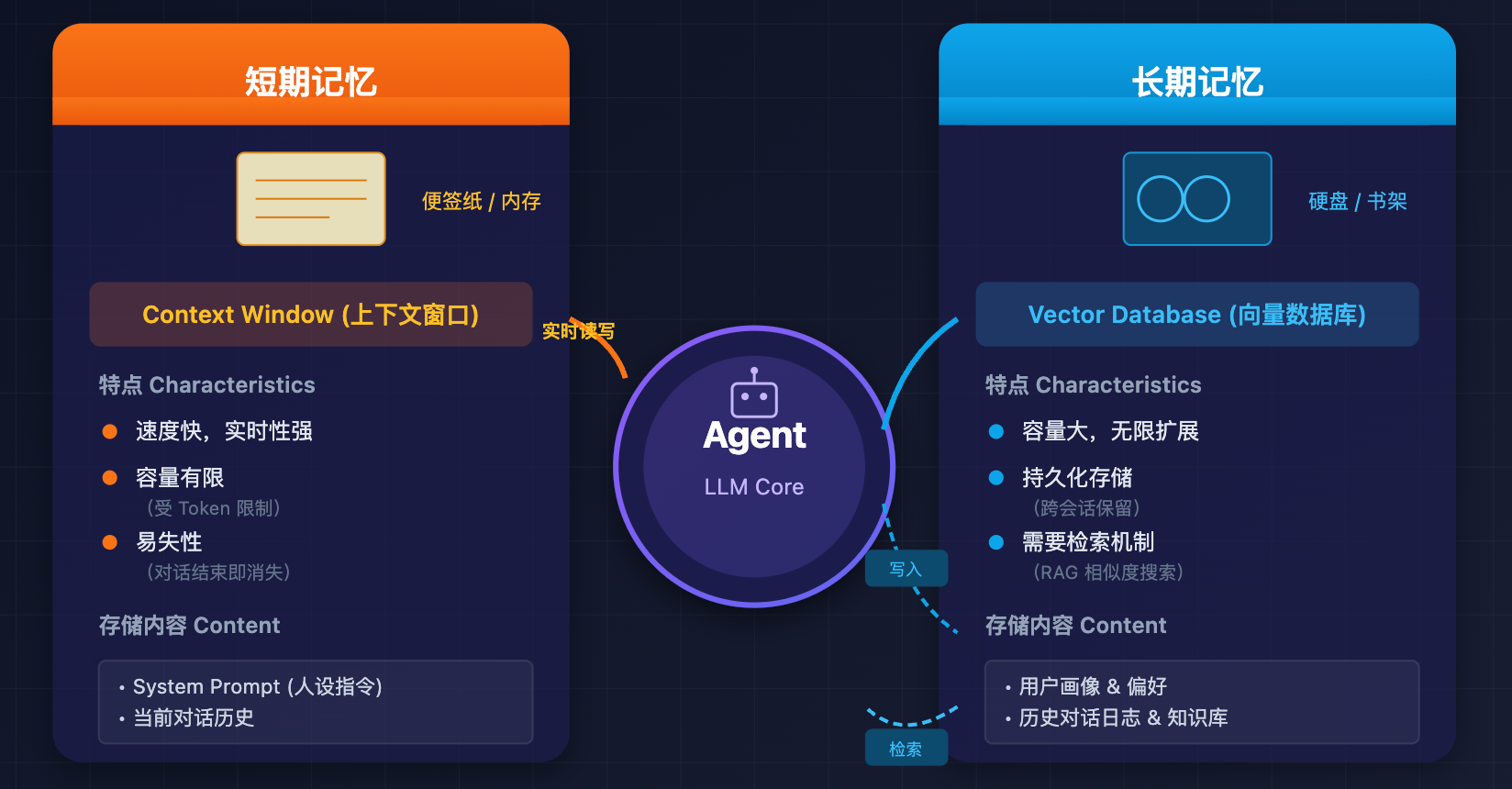 接下来是 记忆系统,它分两层,你可以类比人的记忆方式来理解。短期记忆就是当前这轮对话的上下文,装在 context window 里,Agent 在一次任务执行过程中靠它记住中间状态,比如第一步搜索到了什么、第二步执行结果是什么。这就像人的「工作记忆」,容量有限,任务一结束就清空了。所以还需要长期记忆,通常用向量数据库来实现,把重要信息 embedding 之后存起来,下次用的时候做语义检索拿回来。这就像人的「长期记忆」,容量大、可以跨天保留,但需要主动「回忆」才能调出来。