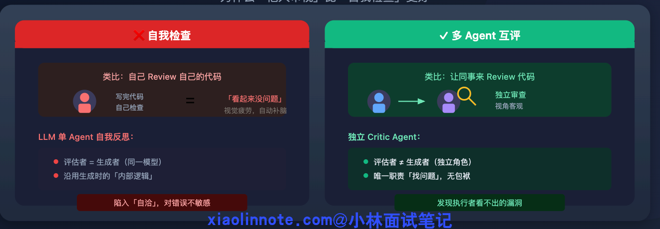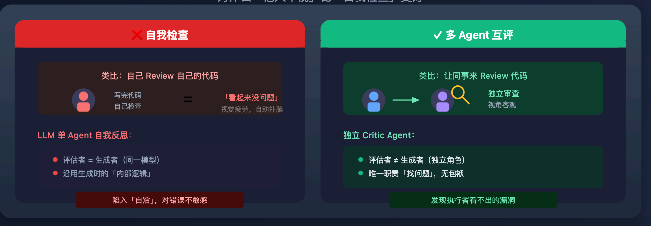 在 LLM 里同样如此:单 Agent 自我反思时,评估者和生成者是同一个模型,它在生成输出时形成的一套「内部逻辑」,做评估时也会沿用这套逻辑,对自己输出的错误不够敏感,容易陷入「自洽」。而独立的 Critic Agent 没有这种包袱,它的唯一职责就是「找问题」,视角更客观,更容易发现执行 Agent 自己看不出来的漏洞。