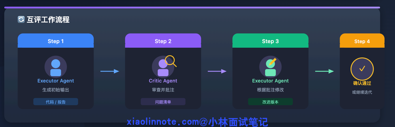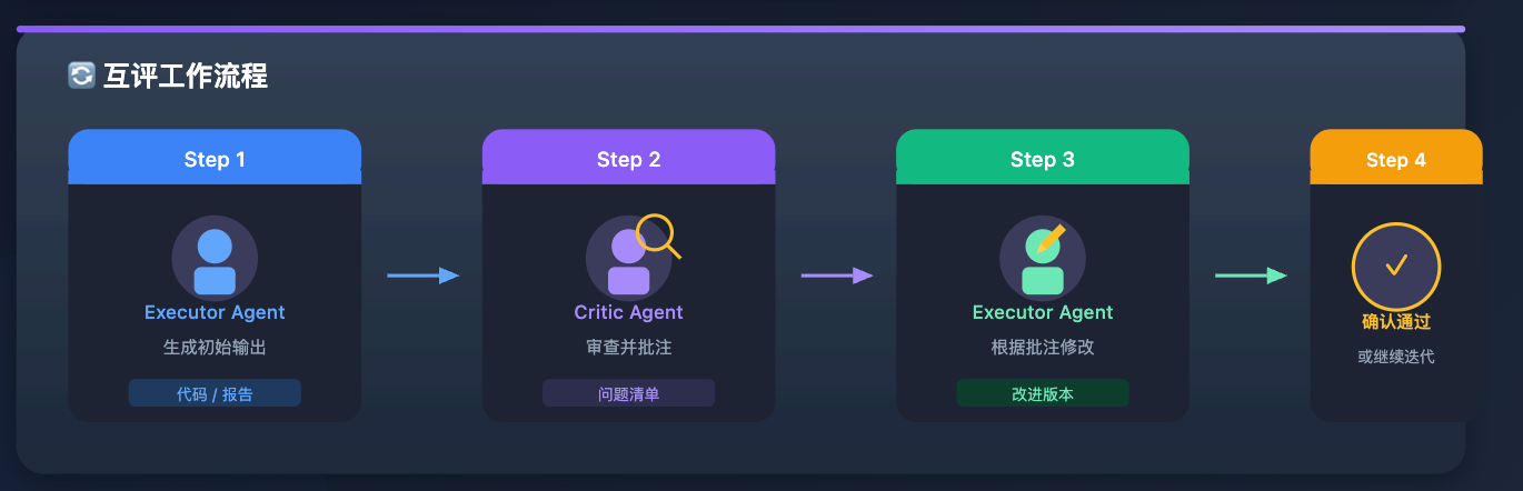 互评的具体流程是:执行 Agent 生成输出,Critic Agent 审查并给出具体批注,执行 Agent 根据批注修改,Critic Agent 再次确认。