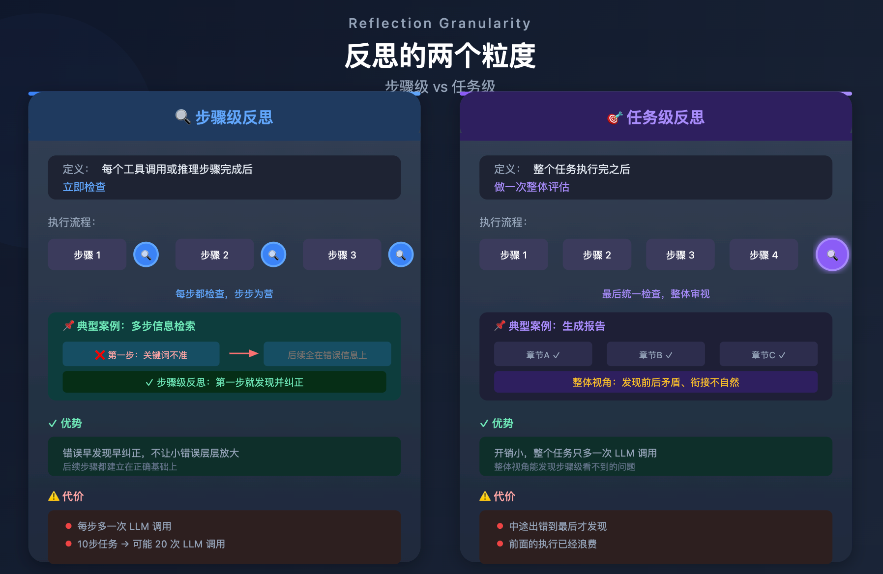 步骤级反思能在第一步就发现关键词的问题,马上纠正,后续步骤都建立在正确基础上。适合这种粒度的场景是步骤之间强依赖、前一步错了后面会全错的任务。代价是每一步都多一次 LLM 调用,整体延迟和 token 消耗会大幅增加,一个 10 步的任务可能实际要调用 20 次 LLM。