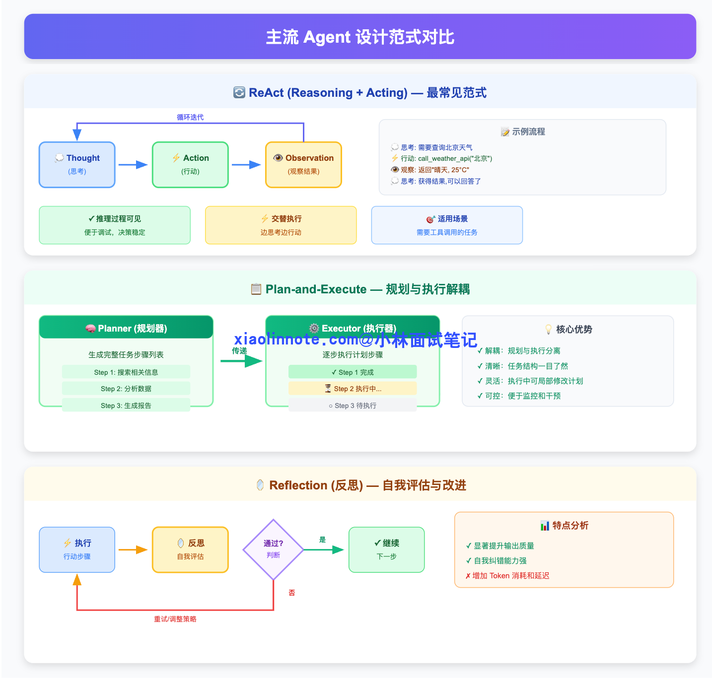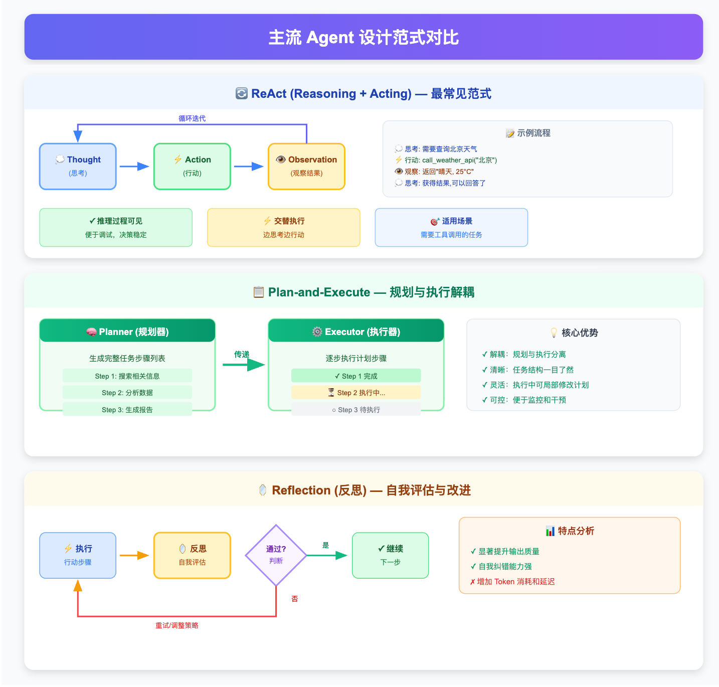 最后要对整体代价有清醒认知:3 轮反思 = 至少 3 倍的 LLM 调用,延迟和成本都线性增加,这是工程上做取舍的核心数字。反思是提升质量的有效手段,但不是免费的,用在刀刃上才有价值,不是每步都做。
