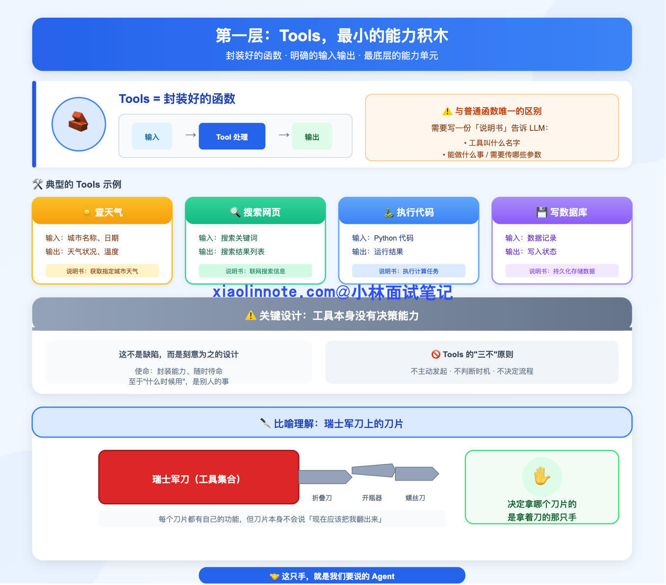 # 每一步都是真实发生的,不是在"假装"你看这段代码,工具定义里没有一行执行逻辑,只有「名字、描述、需要哪些参数」,本质上就是一份说明书。模型读了这份说明书,自己决定该调哪个工具、参数填什么,然后把决策以 JSON 格式告诉你,真正执行的还是你的代码。这个「决策和执行分离」的思想,是理解工具调用最核心的一点。