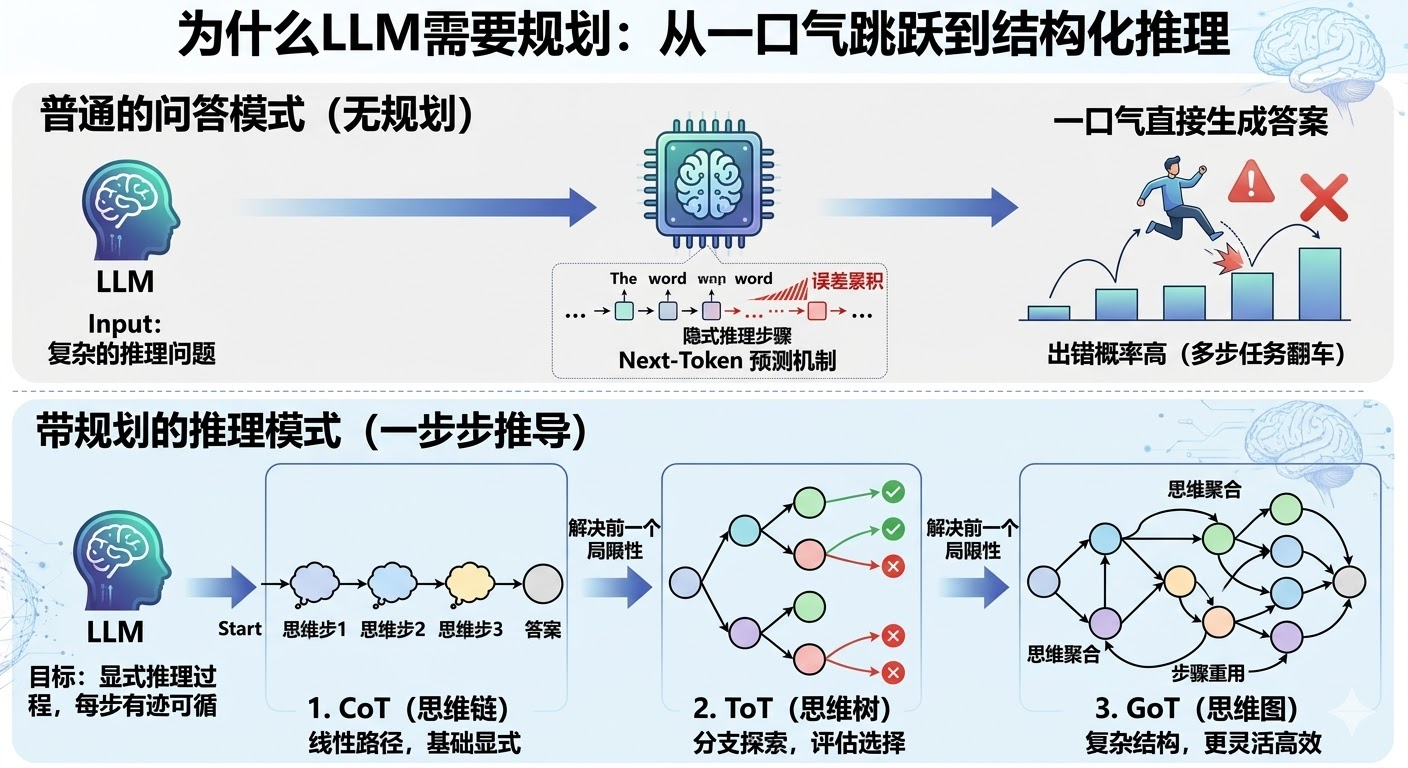 「规划能力」要解决的就是这个问题:把 LLM 隐式的推理过程显式化,让它不再是「一步跳到答案」,而是「一步一步推到答案」,每步都有迹可循。