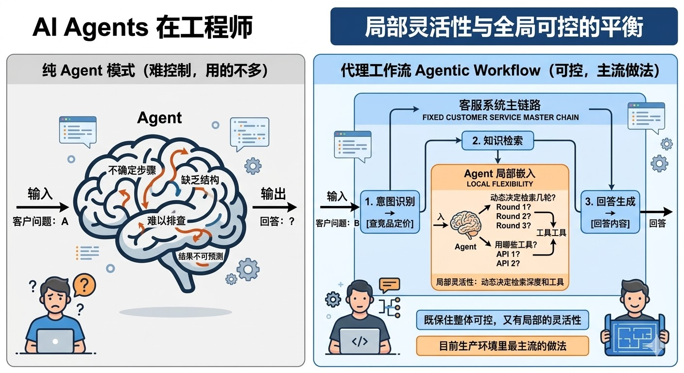 更常见的做法是**「Agentic Workflow」**,整体用 Workflow 框住主流程,在需要灵活处理的节点嵌入 Agent 能力。比如一个客服系统,意图识别 -> 知识检索 -> 回答生成这条主链路是固定的 Workflow,但「知识检索」这个节点内部可以用 Agent 来动态决定检索几轮、用哪些工具。这样既保住了整体可控,又有局部的灵活性,这是目前生产环境里最主流的做法。