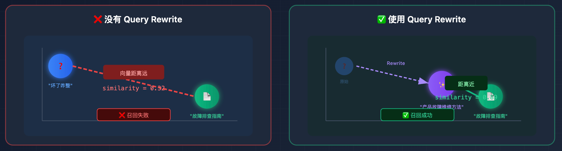 用户和文档写作者之间有一道天然的表述鸿沟。用户可能这样问:「这东西坏了咋整」,而文档里写的是「产品故障排查与维修指南」。你可能会想,这两句话意思差不多,向量检索应该能匹配上吧?遗憾的是,实际效果往往不如预期——即便语义相关,向量相似度也可能低到召回不了正确文档,因为口语和书面语在向量空间里的「坐标」差距不小。
