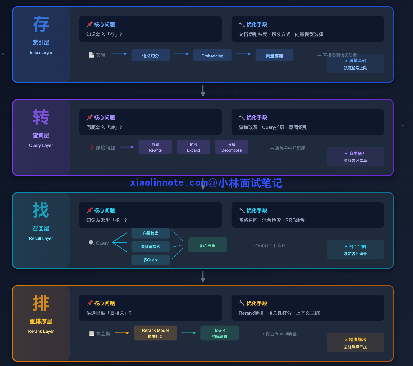 👔面试官:Rerank 是不错,但你说的这些都是零散的手段,你有没有一个系统性的优化框架?索引层、查询层、召回层、重排序层,每一层解决什么问题你能讲清楚吗?