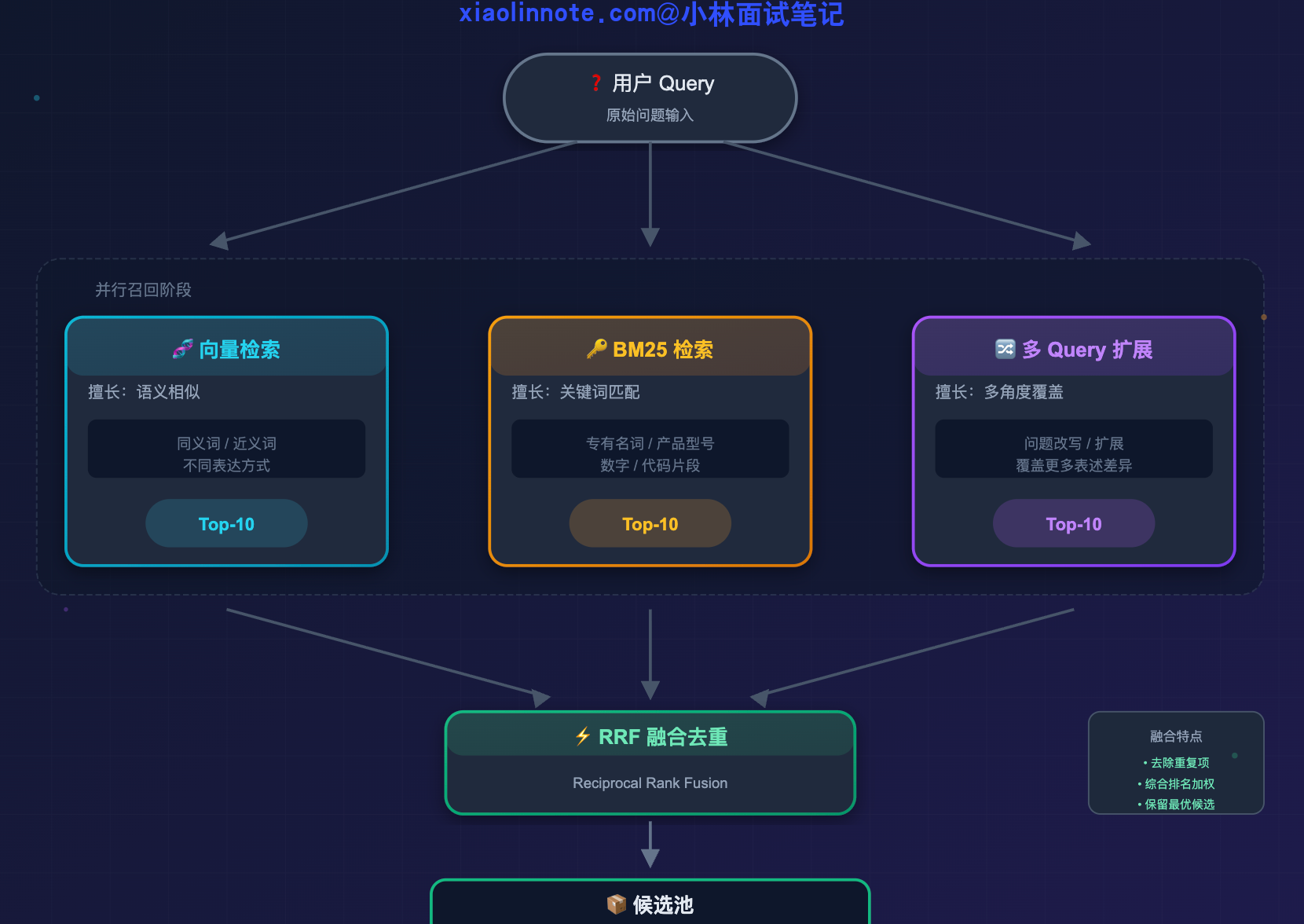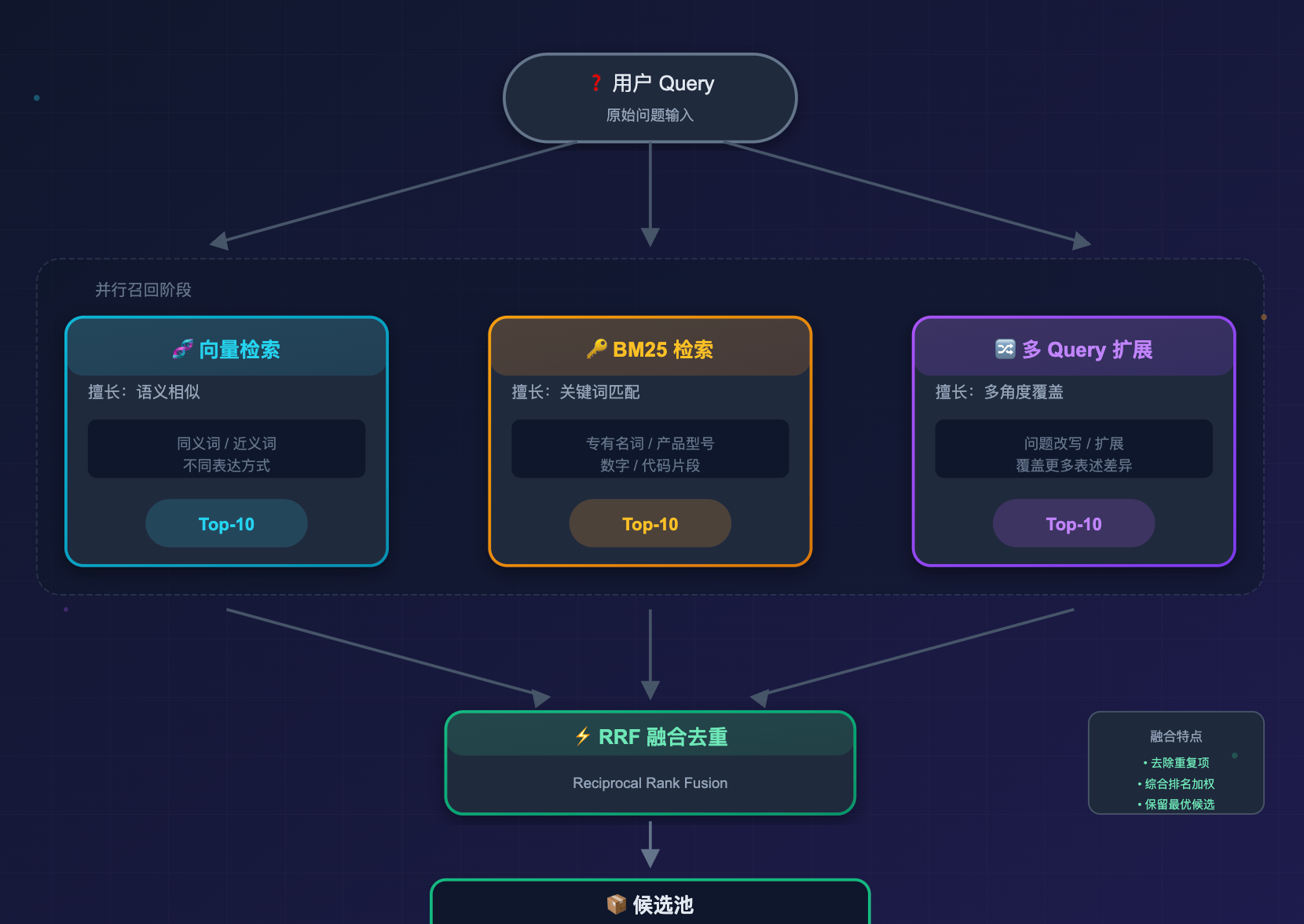 两种检索方式的盲区恰好互补,这就是多路召回的出发点。不只走一条路,同时打开多扇门,把各路结果汇总起来,覆盖更多的可能性。
