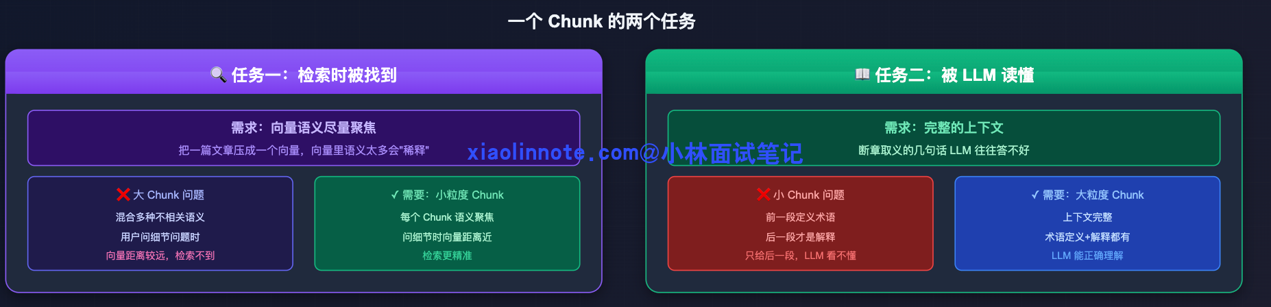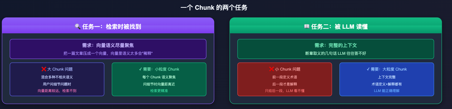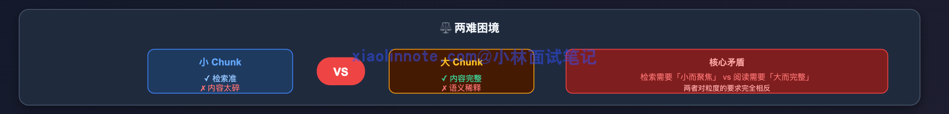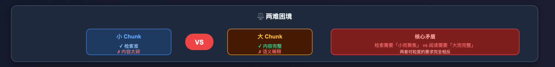 很多人以为直接把 chunk 切小就好了,检索会变准,但切小之后 LLM 拿到的是碎片化的信息,回答质量反而下降。这就是两难困境:小 chunk 检索准但内容太碎,大 chunk 内容完整但检索时语义稀释。