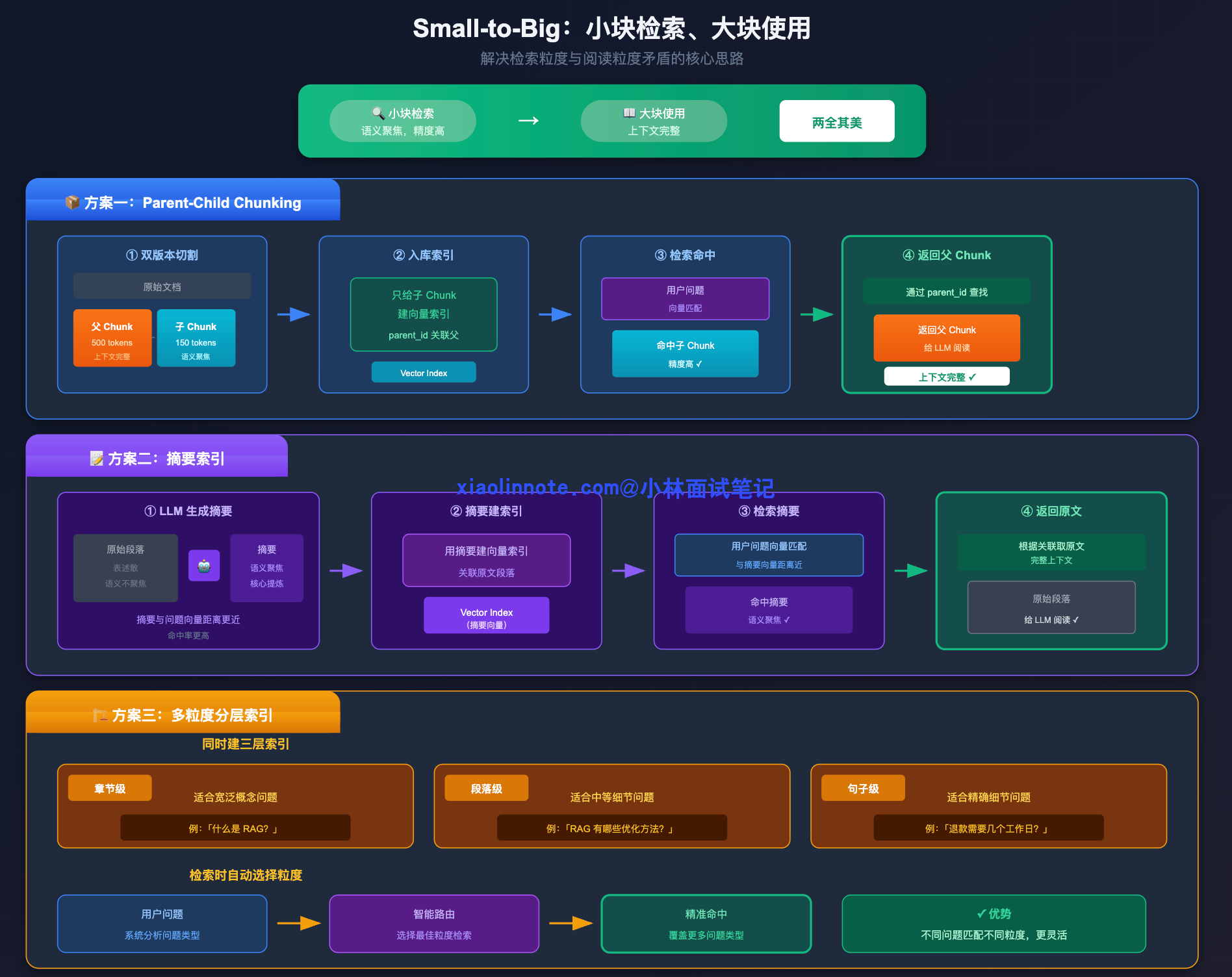 解决这个矛盾的核心思路叫 Small-to-Big,也就是小块检索、大块使用。具体有三种实现方式: