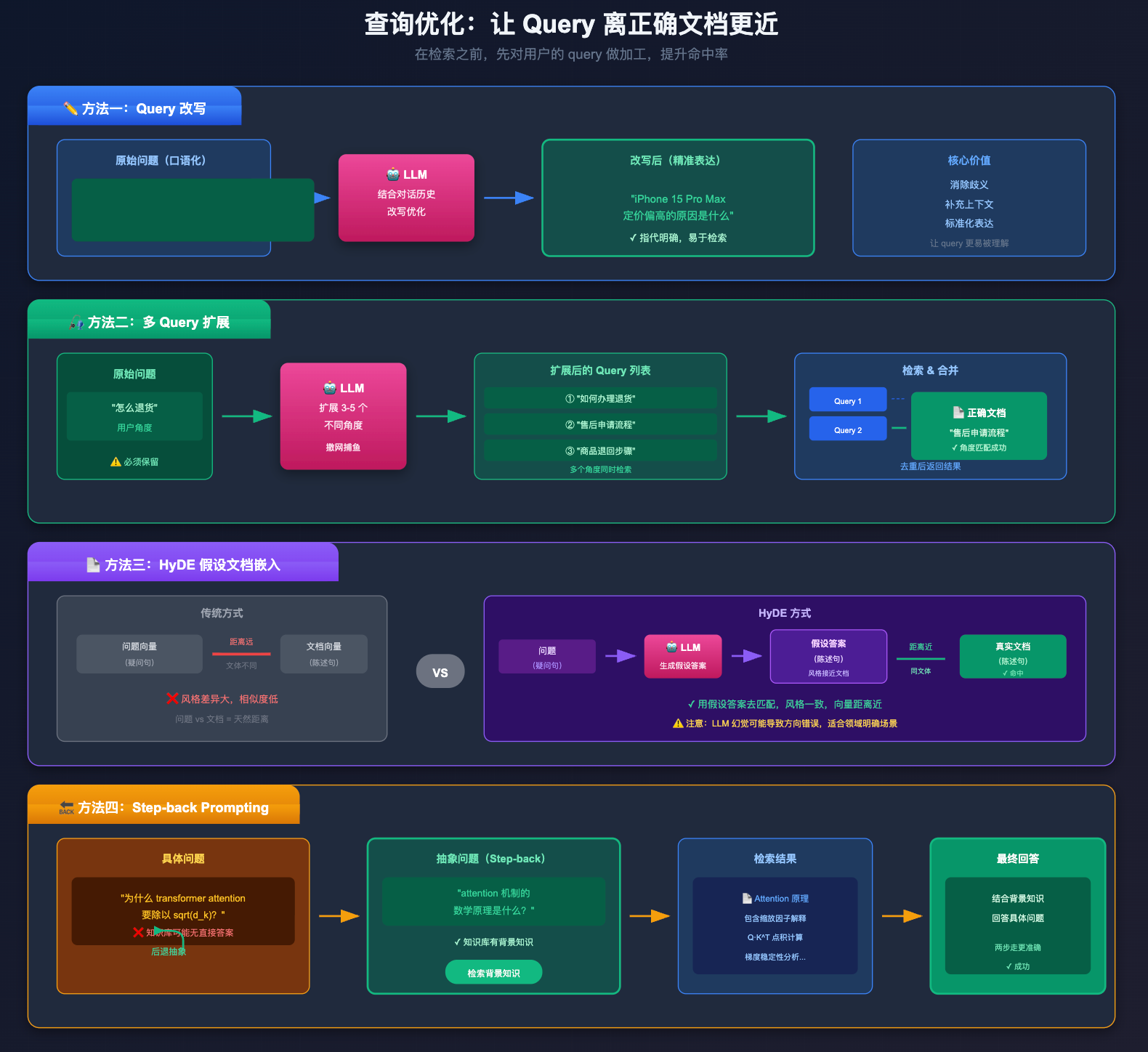 查询优化就是在检索之前,先对用户的 query 做加工,让它在向量空间里离正确文档更近。主要有四种方法。