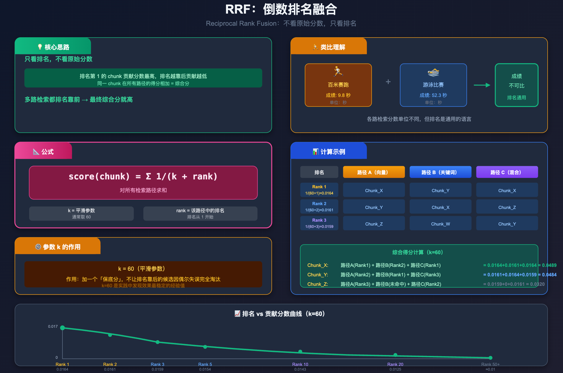 对每一路结果,排名第 1 的 chunk 贡献的分数最高,排名越靠后贡献越低。把同一个 chunk 在所有路径里的得分加起来,就是它的综合分。这样,在多路检索里都排名靠前的 chunk,最终综合分就高。各路检索的分数没法直接比,就像百米赛跑和游泳比赛的成绩单位不同、没有可比性,但排名是通用的语言,综合各路排名来打分才公平。
