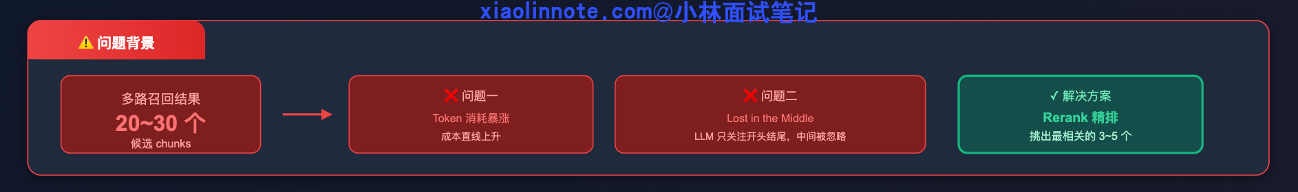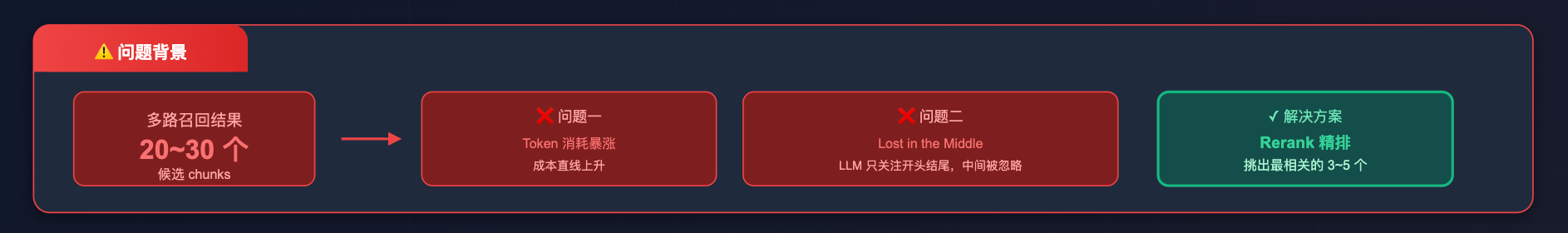 经过前面三层——索引优化、查询优化、多路召回——检索质量已经比朴素 RAG 好了很多,但还差最后一步。多路召回之后,候选 chunk 可能有 20~30 个,这些 chunk 里难免混入一些不太相关的内容,直接全塞给 LLM 会出问题: