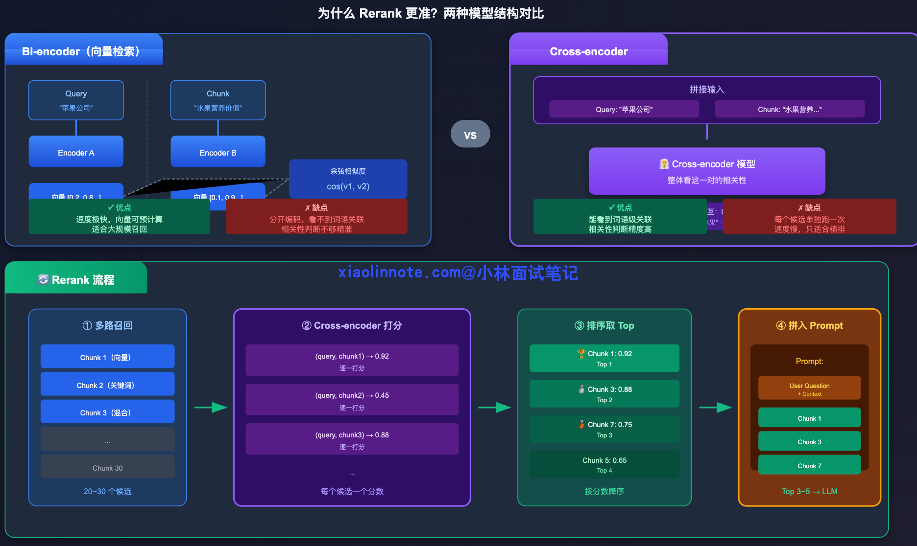 向量检索用的是 Bi-encoder 结构:query 和 chunk 各自独立编码成向量,再算余弦相似度。这个结构的优点是速度极快,因为 chunk 的向量可以提前计算好存库,检索时只要算一次 query 的向量然后做距离比较就行;缺点是 query 和 chunk 是分开编码的,模型没办法看到两段文字之间的具体词语关联,相关性判断不够精准。