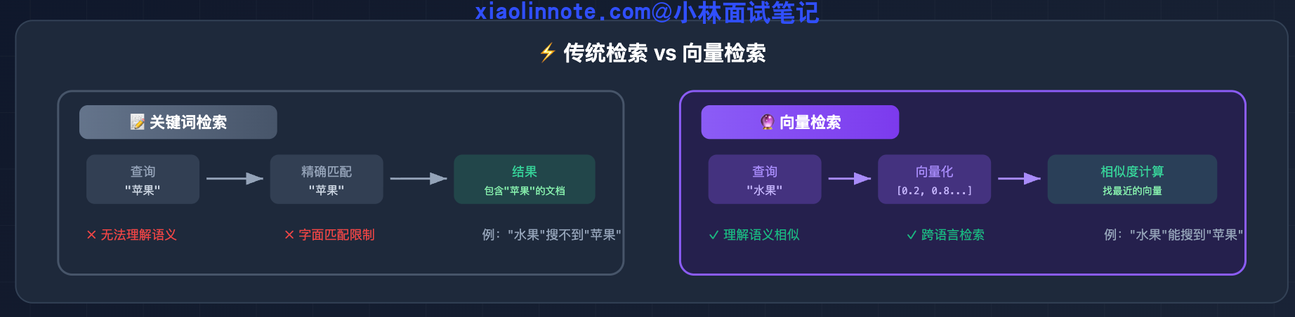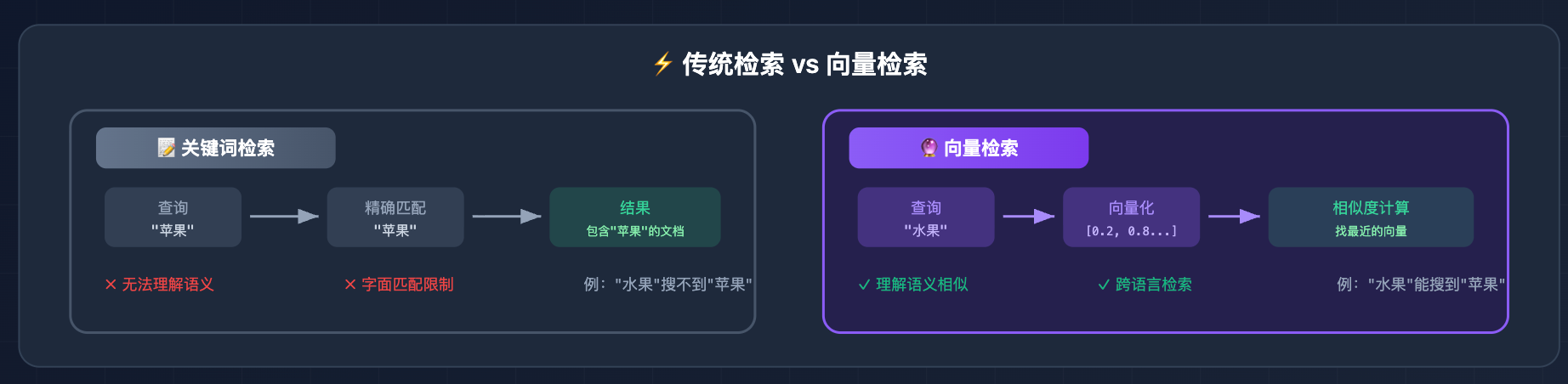 先从向量检索的工作原理说起。向量检索做的事情是:把用户的问题转成一个向量,然后在知识库里找「向量最接近」的文档片段,把它们拼到 prompt 里给 LLM 用。