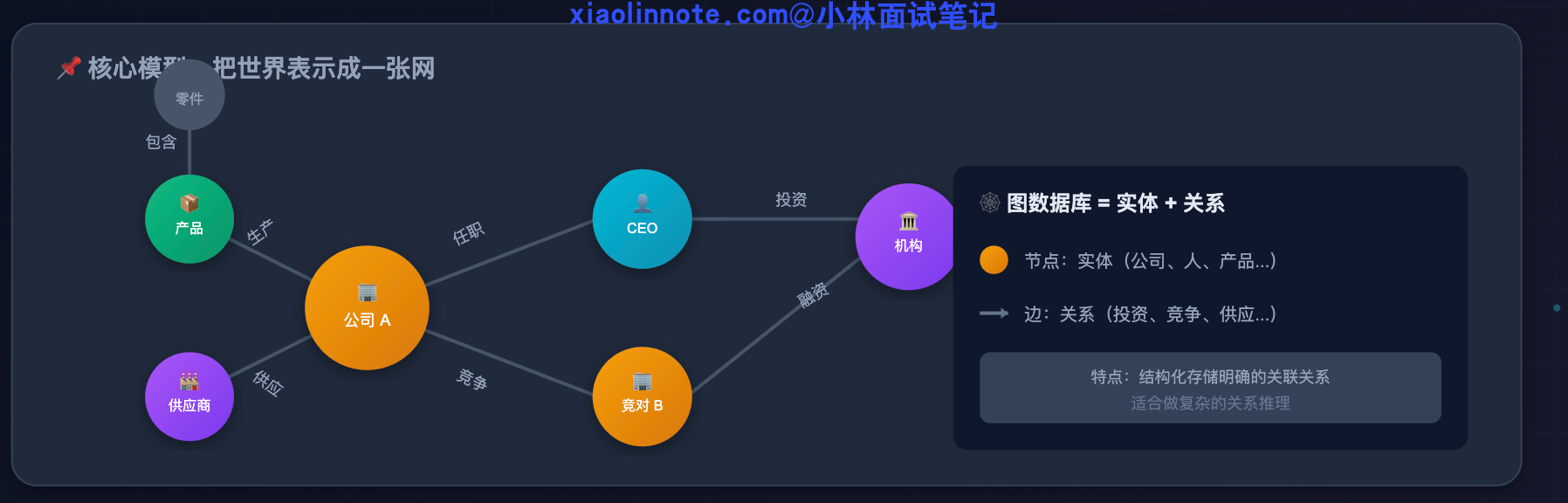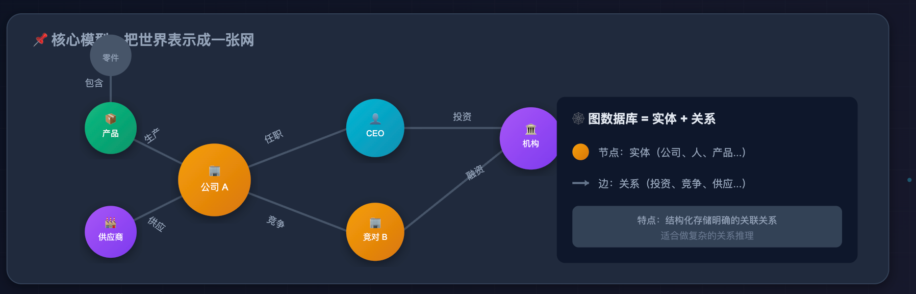 向量检索做不到多跳遍历,这个能力缺口恰恰是图数据库的强项。图数据库专门用来存「实体和关系」,它把世界表示成一张网:每个节点是一个实体(比如公司、人、疾病、药物),每条边是一种关系(比如「投资」「竞争」「治疗」「副作用」)。