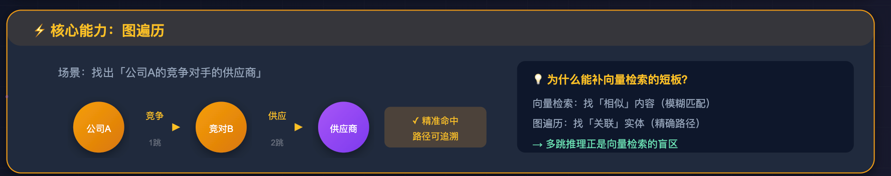 有了这张网之后,就可以做「图遍历」:从一个节点出发,沿着关系边一跳一跳地走,把路径上所有相关节点的信息都收集回来。这正好补了向量检索的短板。