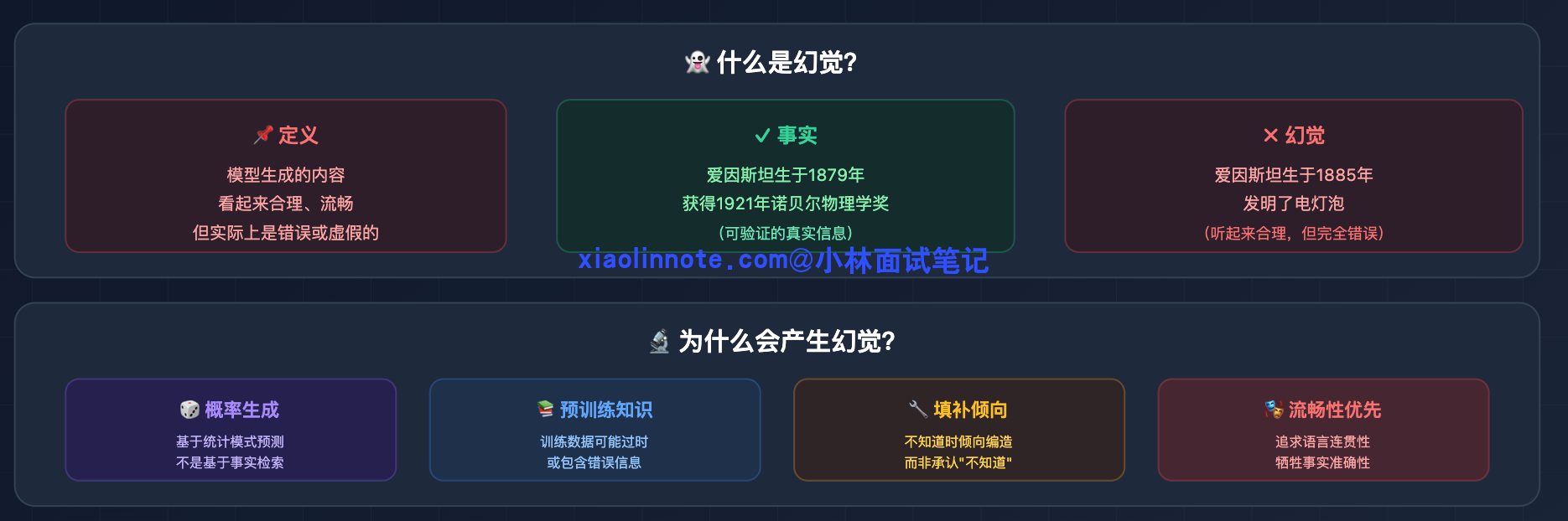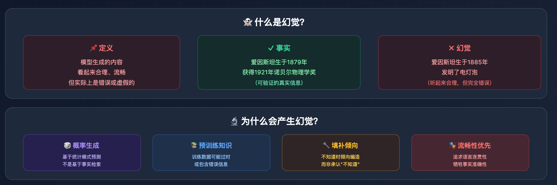 先说「幻觉」这个词是什么意思。LLM 的幻觉,就是模型一本正经地说了一件压根不存在的事。它不是在撒谎,它只是在「预测下一个词」,当它没有可靠依据时,就会拼凑出一个「听起来合理」的答案,但内容可能是错的。