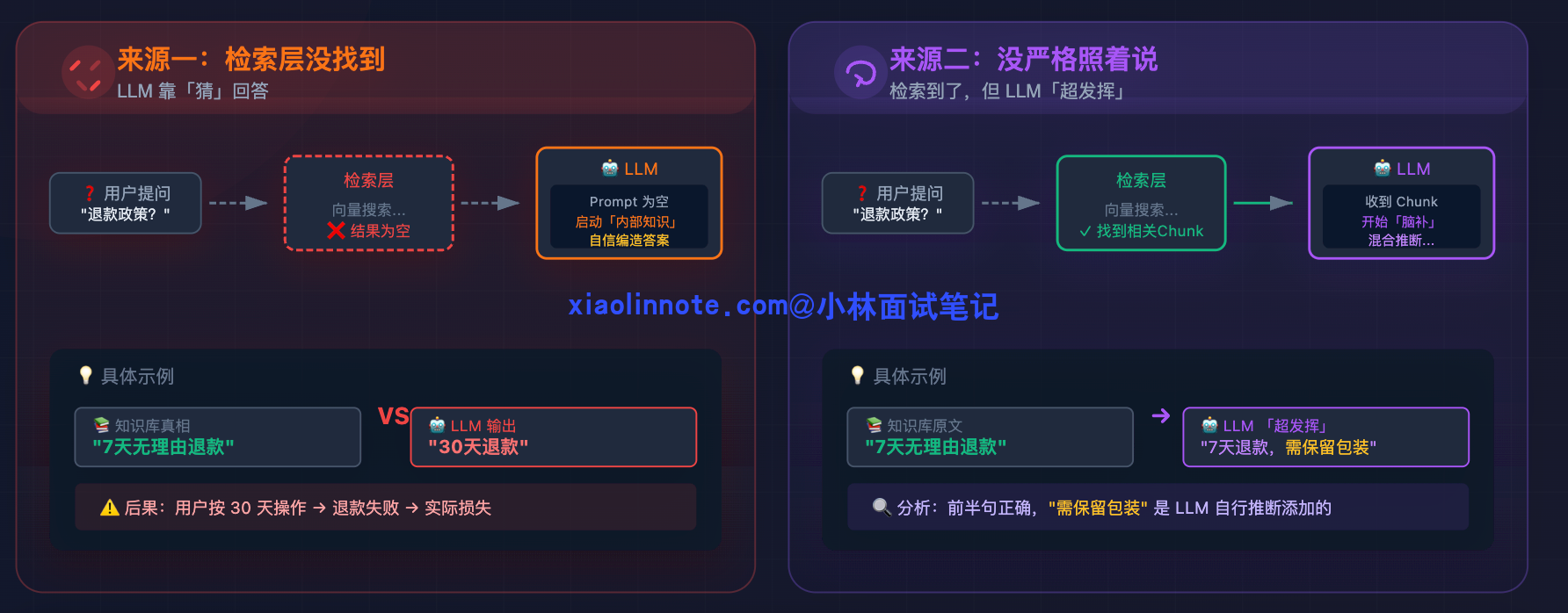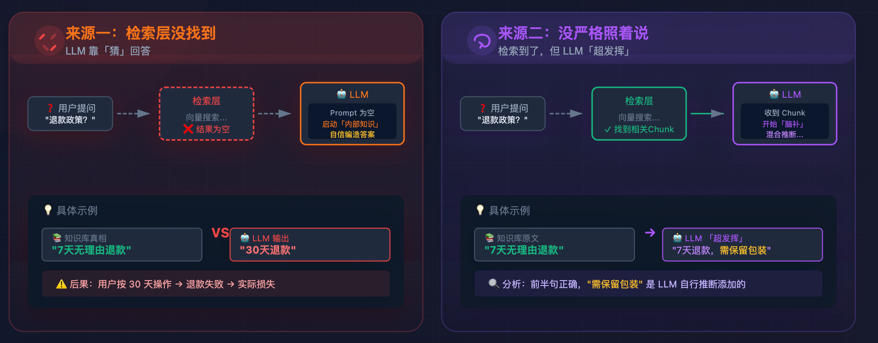 举个具体例子:你的知识库里记录的退款政策是「7 天无理由退款」,但某次检索没召回到这个 chunk,LLM 用自己的「知识」给出了「30 天退款」的答案,用户按这个信息去操作,结果退款失败,这就是检索层幻觉造成的实际损失。