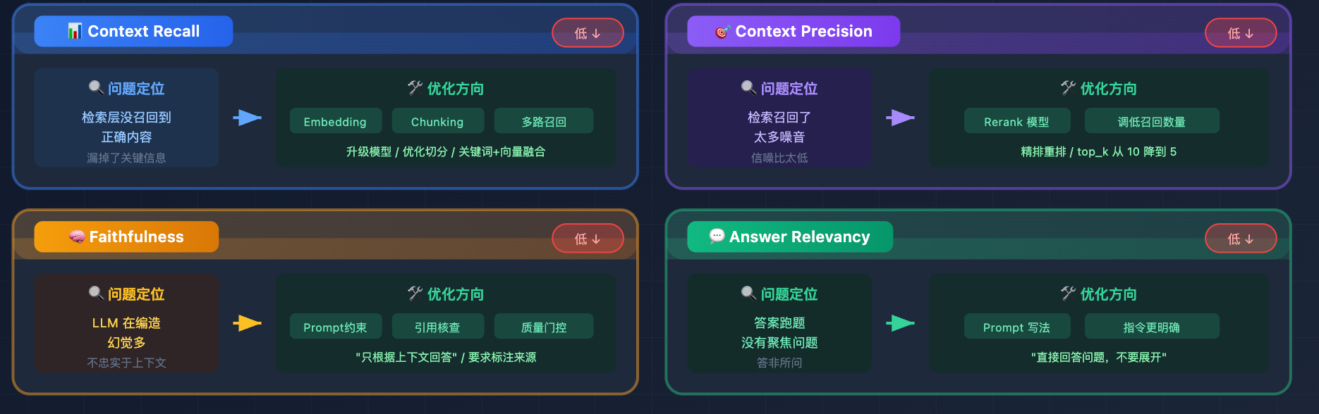 Faithfulness 低,说明 LLM 在编造,幻觉问题多,你回答里说的东西在参考资料里找不到依据,优化方向是加强 Prompt 约束、引入引用核查、或者做检索质量门控,防止低质量上下文进入生成阶段。