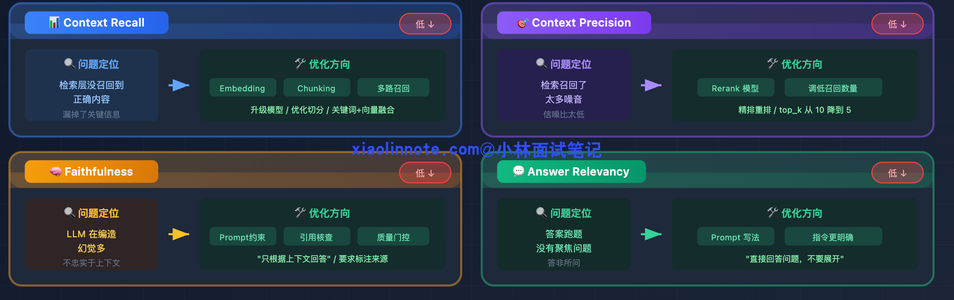 | Answer Relevancy | 生成层 | 答案和问题相不相关 | Prompt 写法问题 |