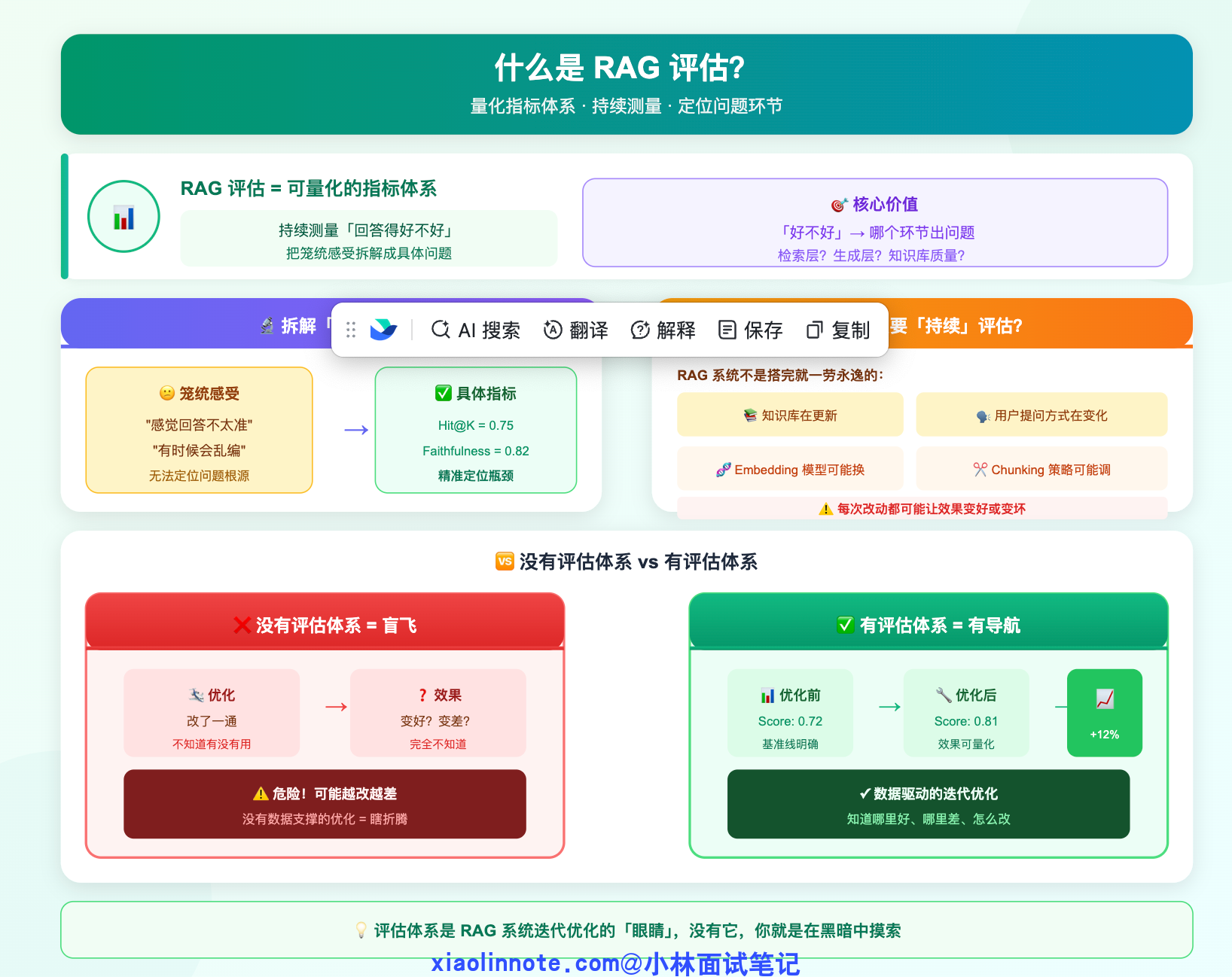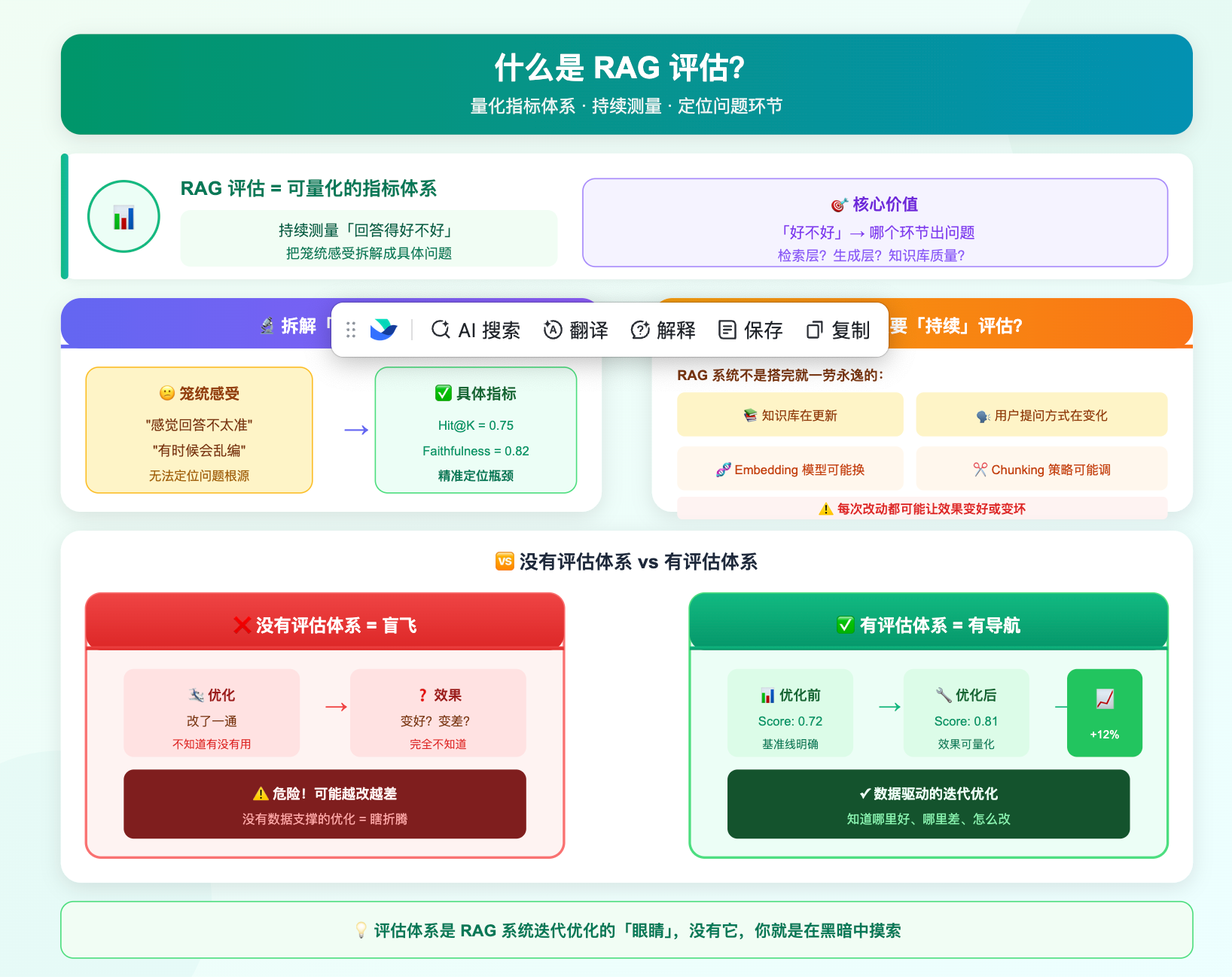 你可能会问,为什么非得强调「持续」?因为 RAG 系统不是搭完就一劳永逸的。知识库在更新,用户的提问方式在变化,Embedding 模型可能要换,Chunking 策略可能要调,每一次改动都可能让效果变好或者变坏。没有评估体系,你就是在盲飞,不知道自己的优化到底有没有用,甚至不知道改完之后系统是变好了还是变差了。
