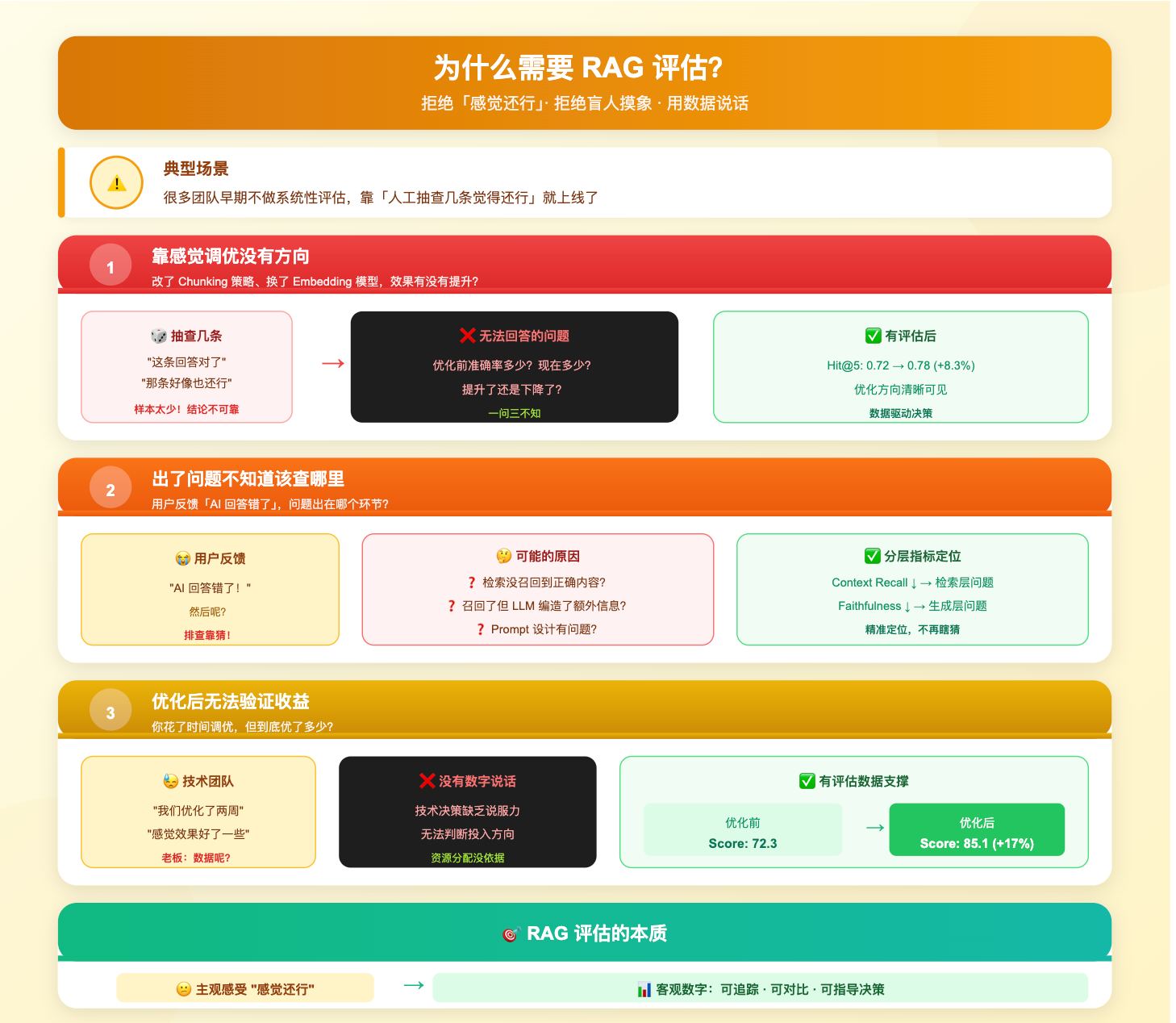 首先,靠感觉调优没有方向。改了 Chunking 策略、换了 Embedding 模型,系统效果有没有提升?抽查几条根本说明不了问题,样本太少,结论不可靠。