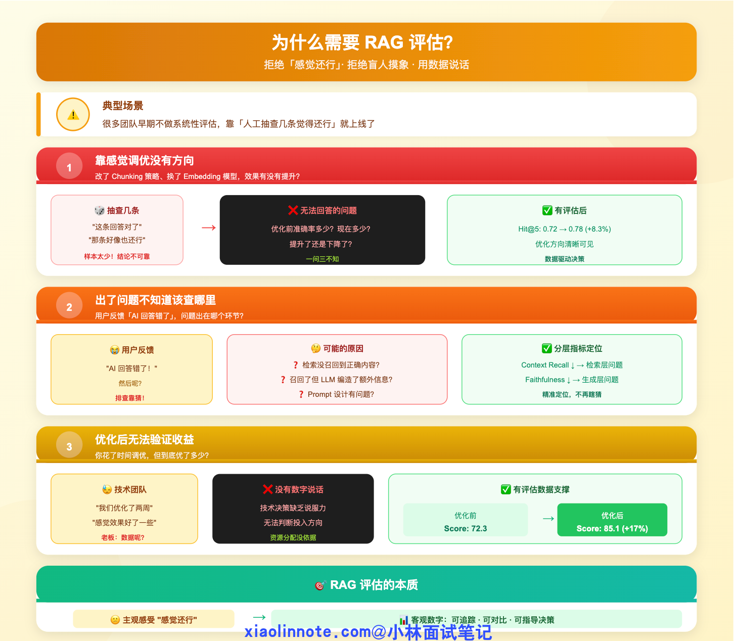👔面试官:几十条样本能代表什么?而且人工抽查主观性太强,不同人标准不一样,你换个人来评估结论可能完全不同。我问的是你怎么系统性地、可量化地评估 RAG 的效果,能定位到具体哪个环节出了问题。