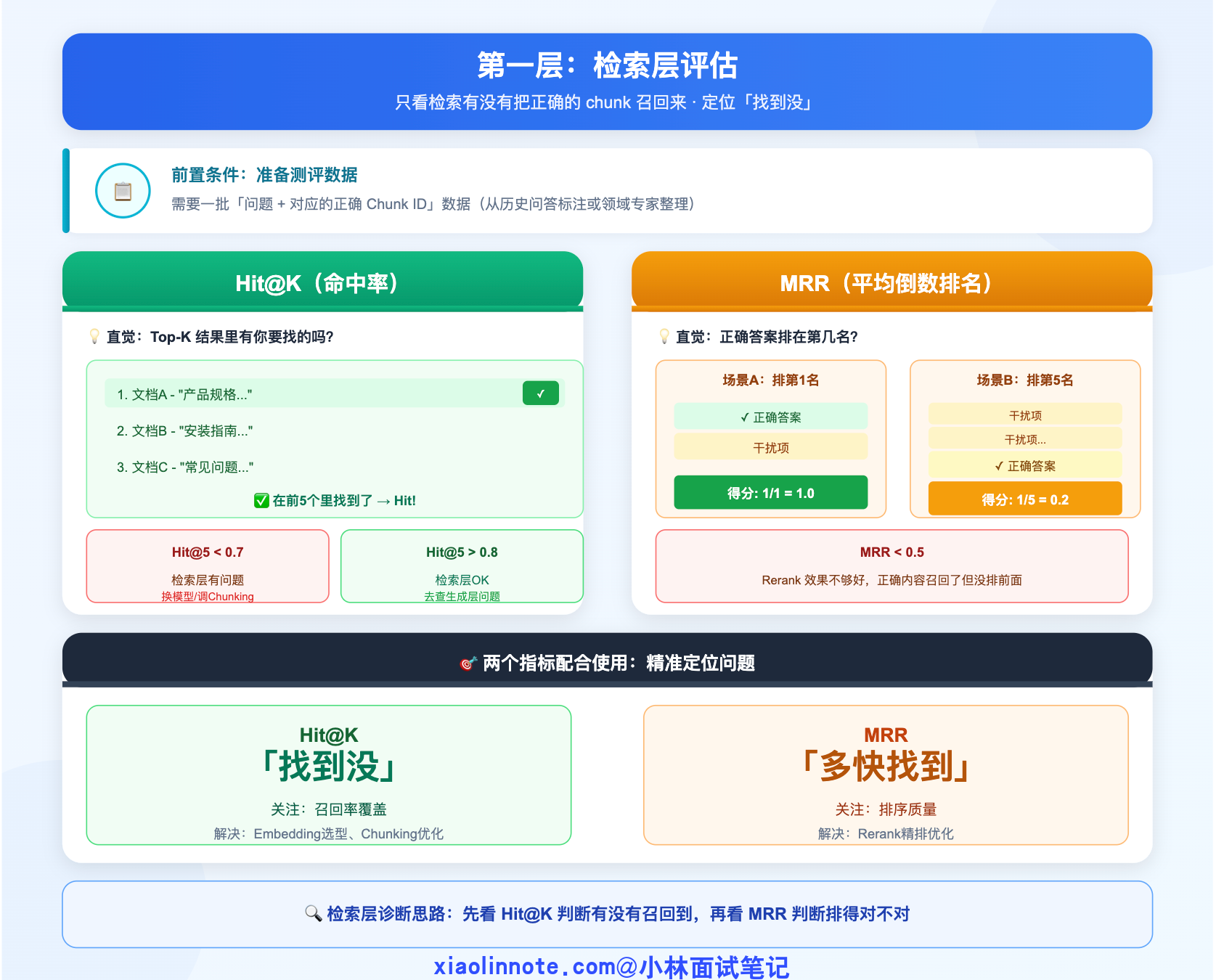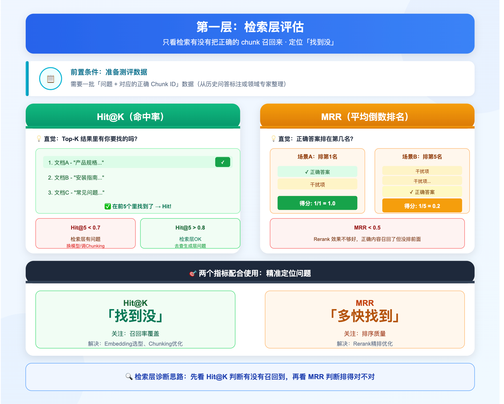 | Hit@K | 检索层 | 正确 chunk 是否被召回 | Embedding 或 Chunking 有问题 |